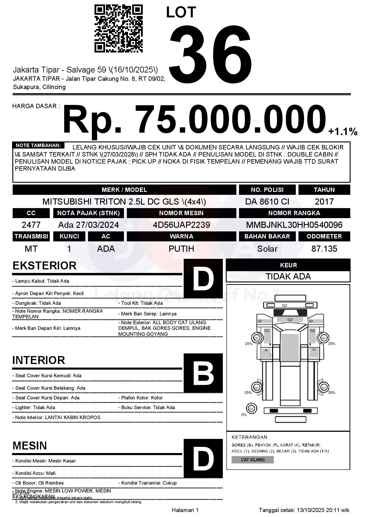 - Kondisi objek lelang dilelang apa adanya, baik kondisi fisik, mesin maupun legalitas kendaraan. Jika terdapat kekurangan/cacat baik yang terlihat maupun yang tidak terlihat, maka semua akan menjadi tanggung jawab/risiko Pemenang Lelang. Oleh karena itu, Pemenang Lelang melepaskan segala hak untuk menuntut dan/atau meminta ganti rugi atas hal tersebut kepada JBA.