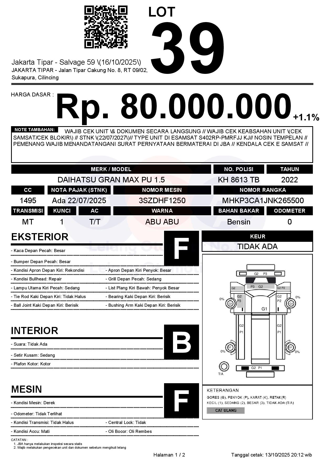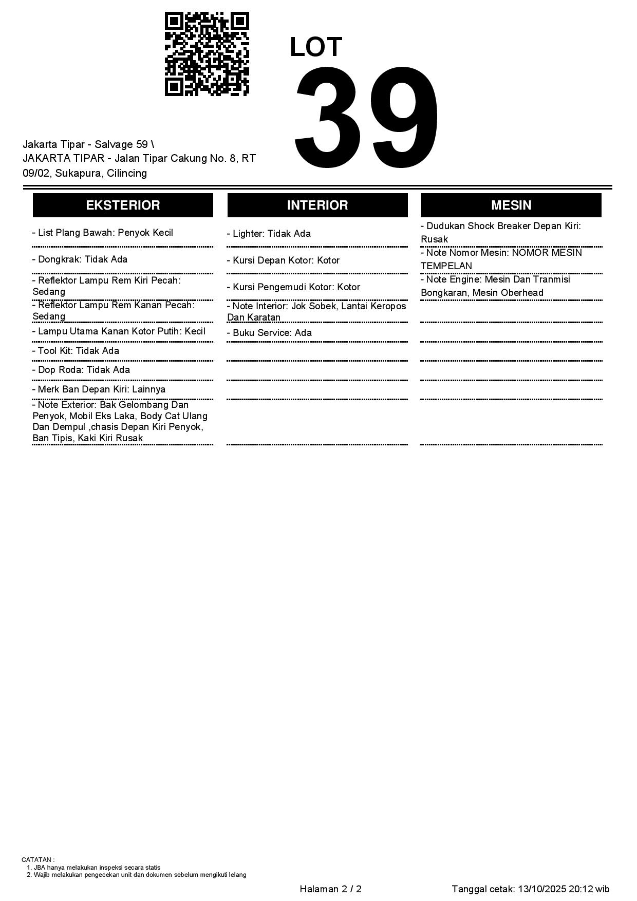 - Kondisi objek lelang dilelang apa adanya, baik kondisi fisik, mesin maupun legalitas kendaraan. Jika terdapat kekurangan/cacat baik yang terlihat maupun yang tidak terlihat, maka semua akan menjadi tanggung jawab/risiko Pemenang Lelang. Oleh karena itu, Pemenang Lelang melepaskan segala hak untuk menuntut dan/atau meminta ganti rugi atas hal tersebut kepada JBA.