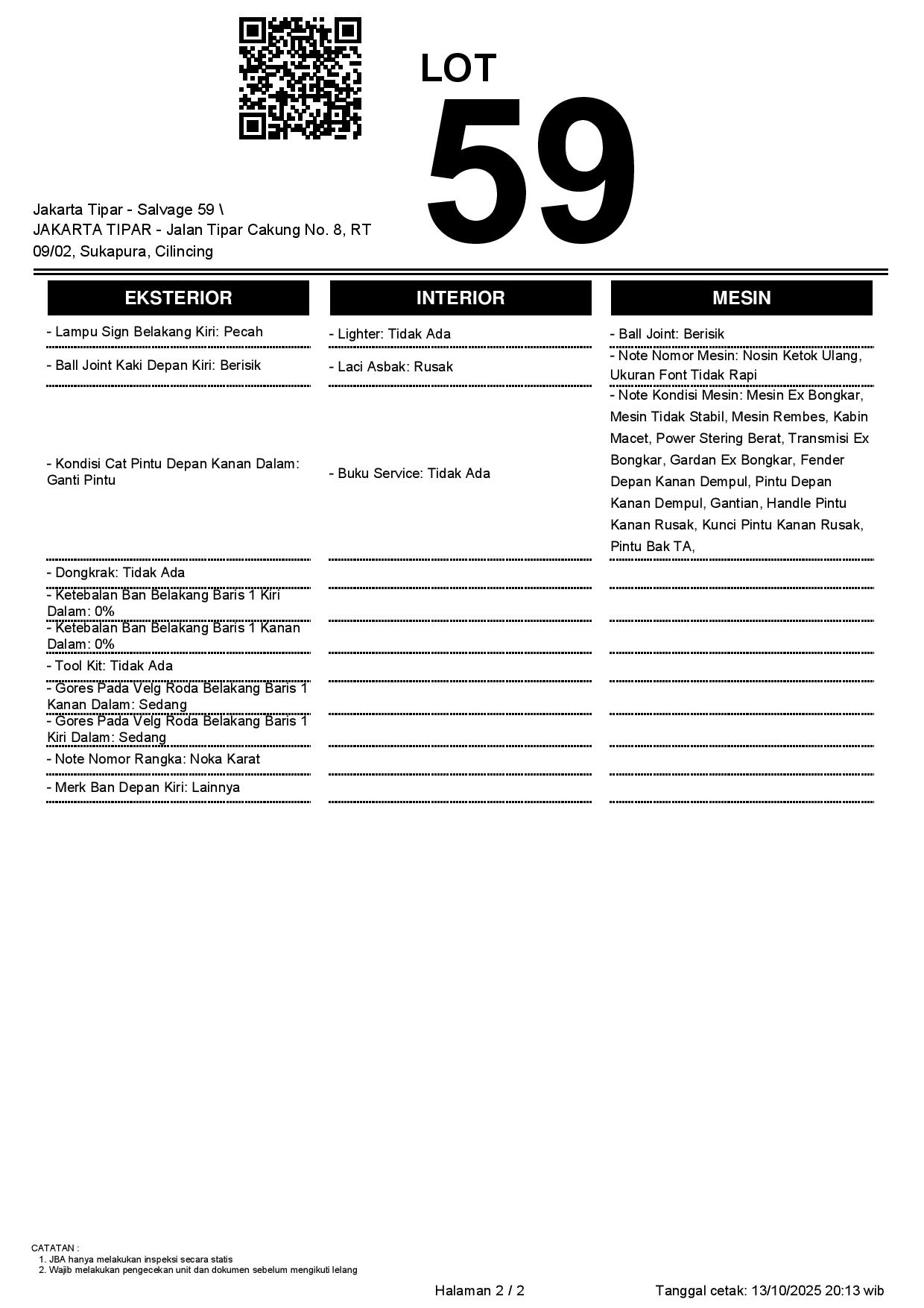 - Kondisi objek lelang dilelang apa adanya, baik kondisi fisik, mesin maupun legalitas kendaraan. Jika terdapat kekurangan/cacat baik yang terlihat maupun yang tidak terlihat, maka semua akan menjadi tanggung jawab/risiko Pemenang Lelang. Oleh karena itu, Pemenang Lelang melepaskan segala hak untuk menuntut dan/atau meminta ganti rugi atas hal tersebut kepada JBA.