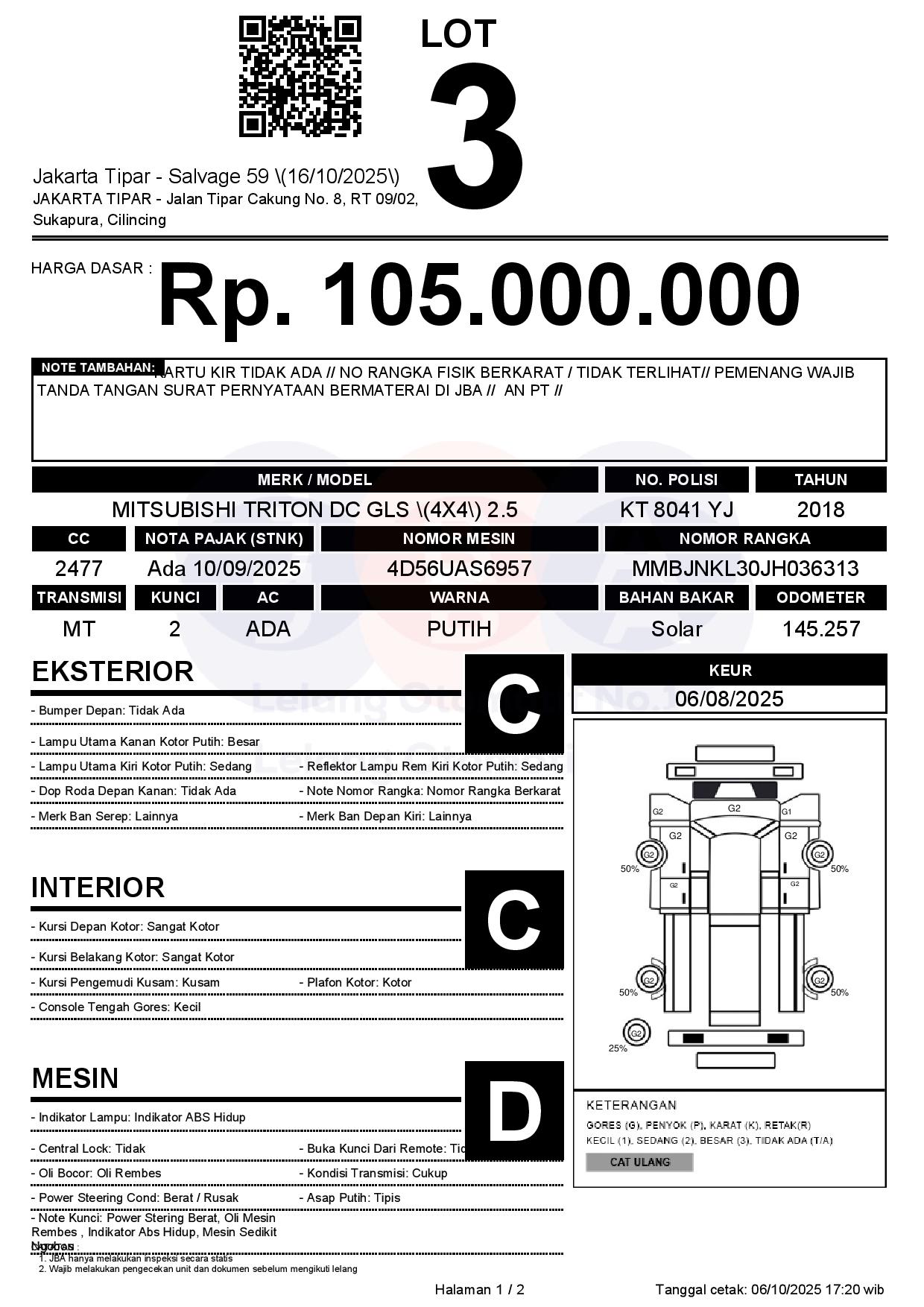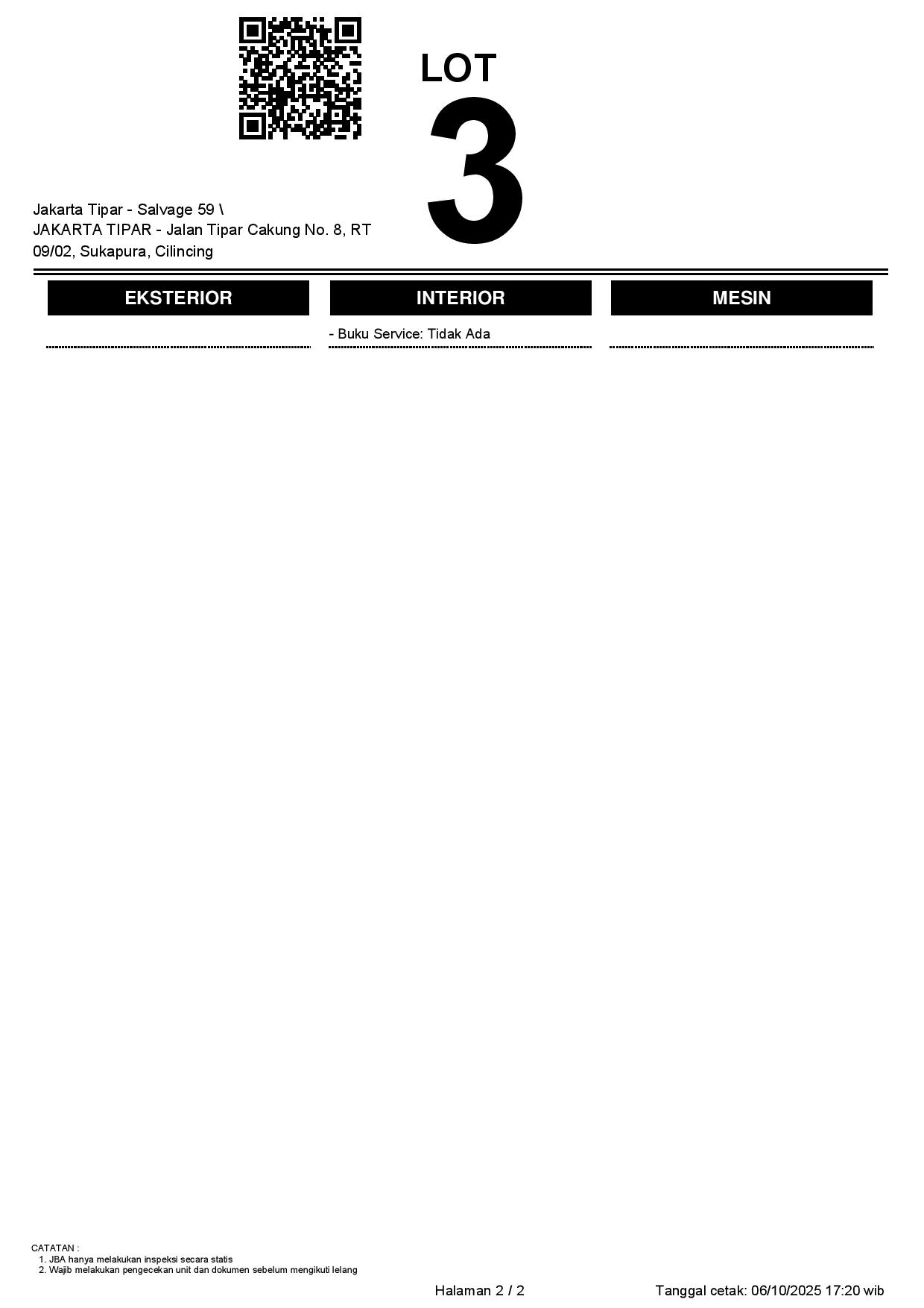 - Kondisi objek lelang dilelang apa adanya, baik kondisi fisik, mesin maupun legalitas kendaraan. Jika terdapat kekurangan/cacat baik yang terlihat maupun yang tidak terlihat, maka semua akan menjadi tanggung jawab/risiko Pemenang Lelang. Oleh karena itu, Pemenang Lelang melepaskan segala hak untuk menuntut dan/atau meminta ganti rugi atas hal tersebut kepada JBA.
