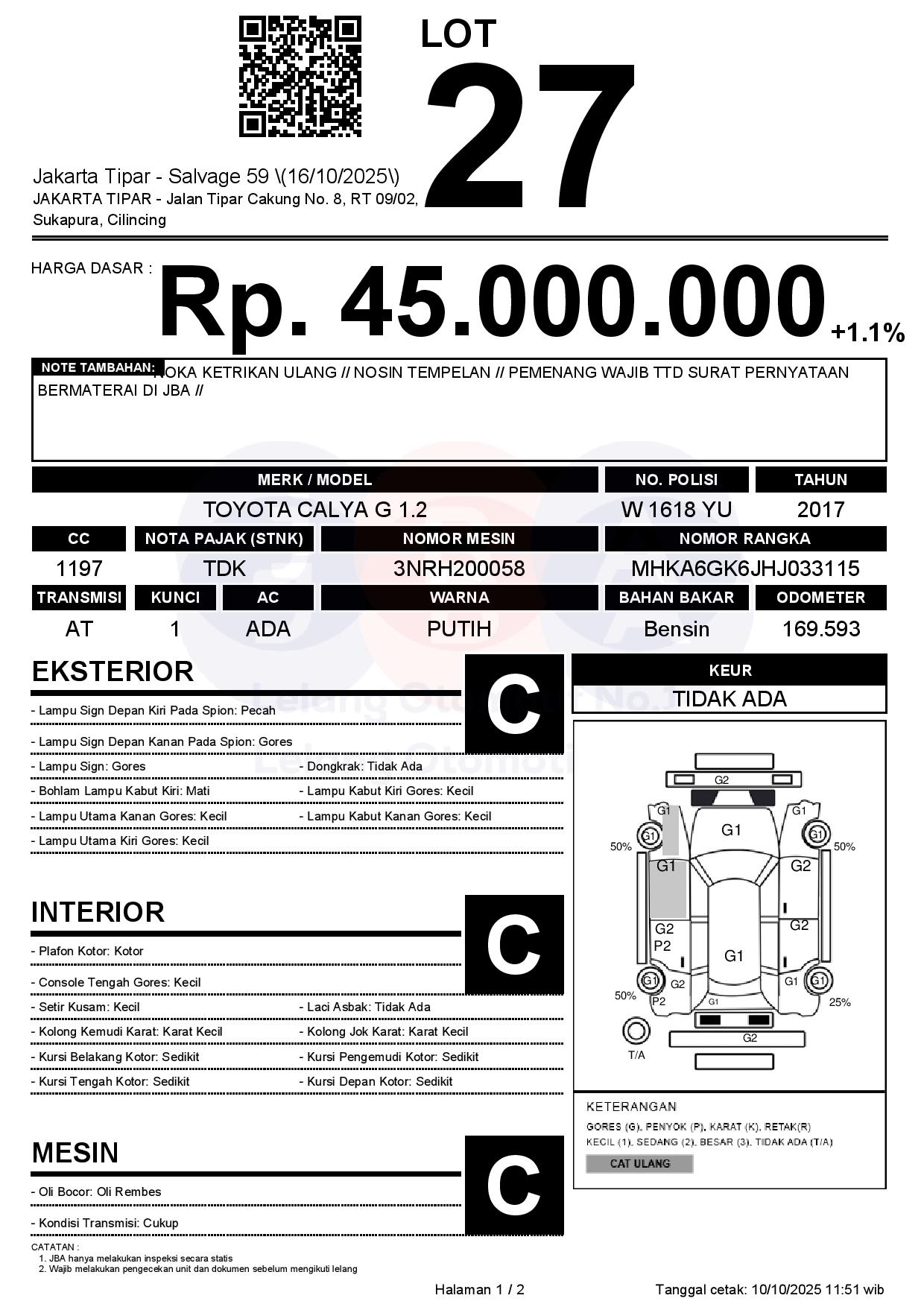- Kondisi objek lelang dilelang apa adanya, baik kondisi fisik, mesin maupun legalitas kendaraan. Jika terdapat kekurangan/cacat baik yang terlihat maupun yang tidak terlihat, maka semua akan menjadi tanggung jawab/risiko Pemenang Lelang. Oleh karena itu, Pemenang Lelang melepaskan segala hak untuk menuntut dan/atau meminta ganti rugi atas hal tersebut kepada JBA.