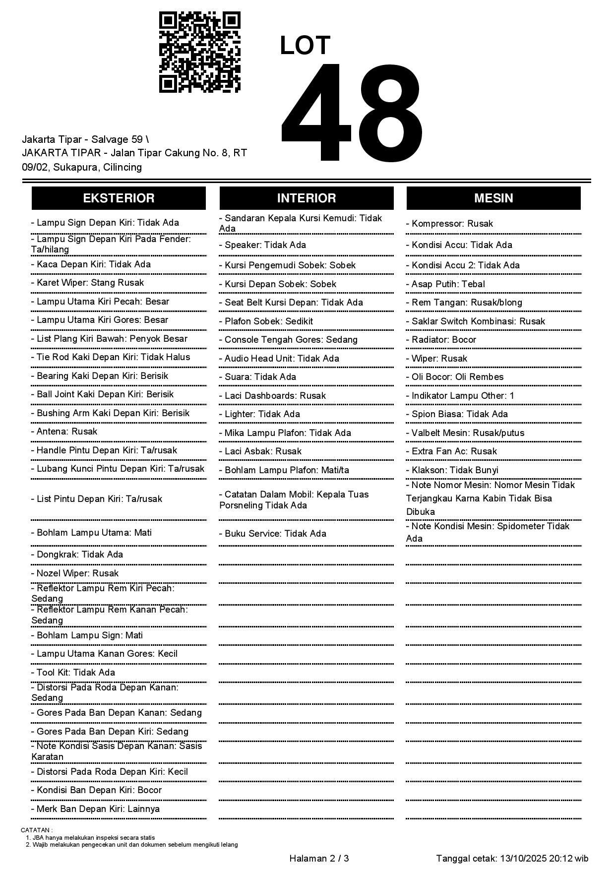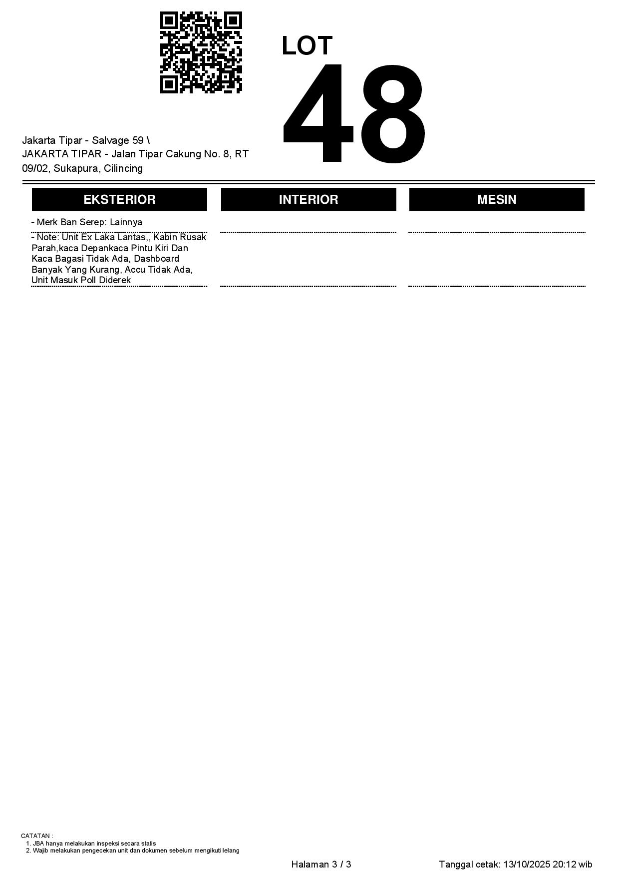 - Kondisi objek lelang dilelang apa adanya, baik kondisi fisik, mesin maupun legalitas kendaraan. Jika terdapat kekurangan/cacat baik yang terlihat maupun yang tidak terlihat, maka semua akan menjadi tanggung jawab/risiko Pemenang Lelang. Oleh karena itu, Pemenang Lelang melepaskan segala hak untuk menuntut dan/atau meminta ganti rugi atas hal tersebut kepada JBA.
