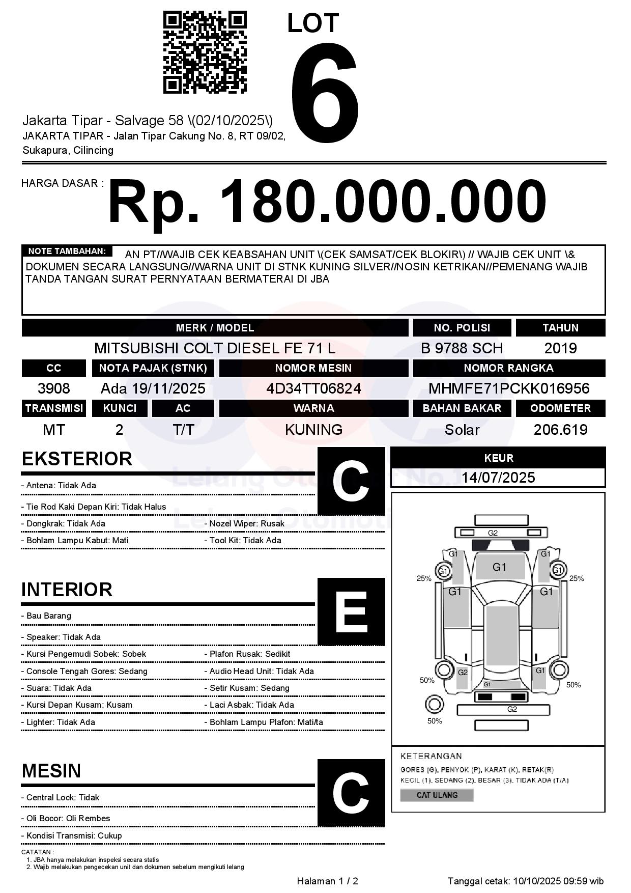 - Kondisi objek lelang dilelang apa adanya, baik kondisi fisik, mesin maupun legalitas kendaraan. Jika terdapat kekurangan/cacat baik yang terlihat maupun yang tidak terlihat, maka semua akan menjadi tanggung jawab/risiko Pemenang Lelang. Oleh karena itu, Pemenang Lelang melepaskan segala hak untuk menuntut dan/atau meminta ganti rugi atas hal tersebut kepada JBA.