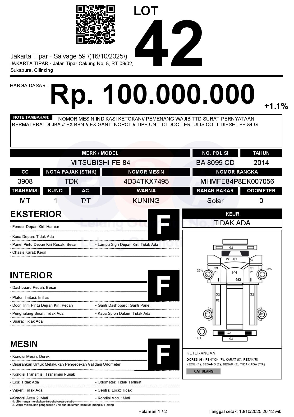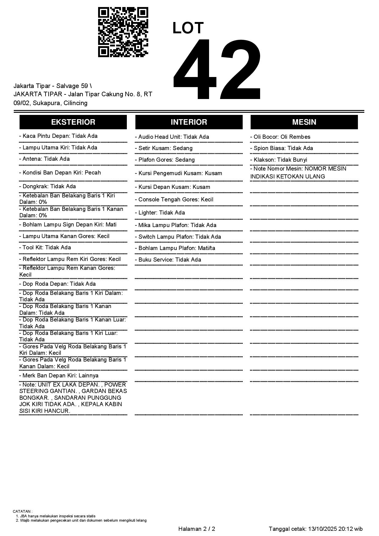 - Kondisi objek lelang dilelang apa adanya, baik kondisi fisik, mesin maupun legalitas kendaraan. Jika terdapat kekurangan/cacat baik yang terlihat maupun yang tidak terlihat, maka semua akan menjadi tanggung jawab/risiko Pemenang Lelang. Oleh karena itu, Pemenang Lelang melepaskan segala hak untuk menuntut dan/atau meminta ganti rugi atas hal tersebut kepada JBA.