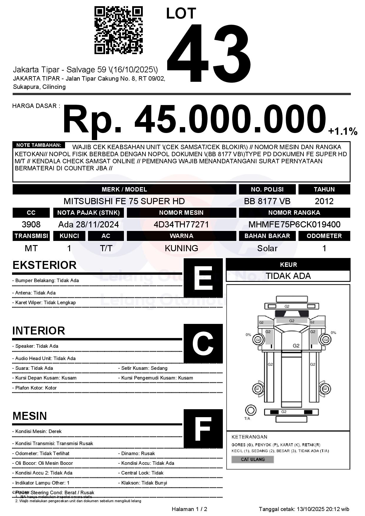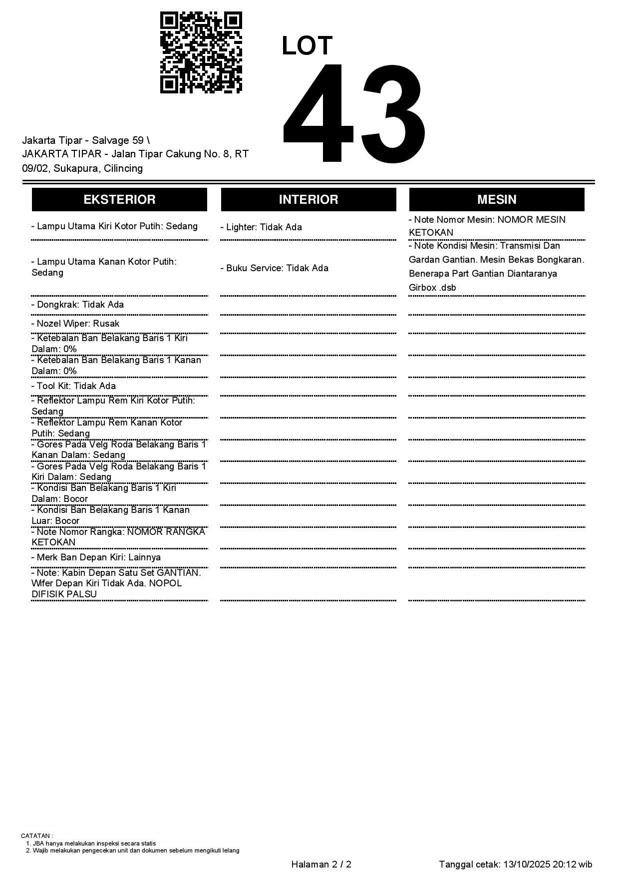 - Kondisi objek lelang dilelang apa adanya, baik kondisi fisik, mesin maupun legalitas kendaraan. Jika terdapat kekurangan/cacat baik yang terlihat maupun yang tidak terlihat, maka semua akan menjadi tanggung jawab/risiko Pemenang Lelang. Oleh karena itu, Pemenang Lelang melepaskan segala hak untuk menuntut dan/atau meminta ganti rugi atas hal tersebut kepada JBA.