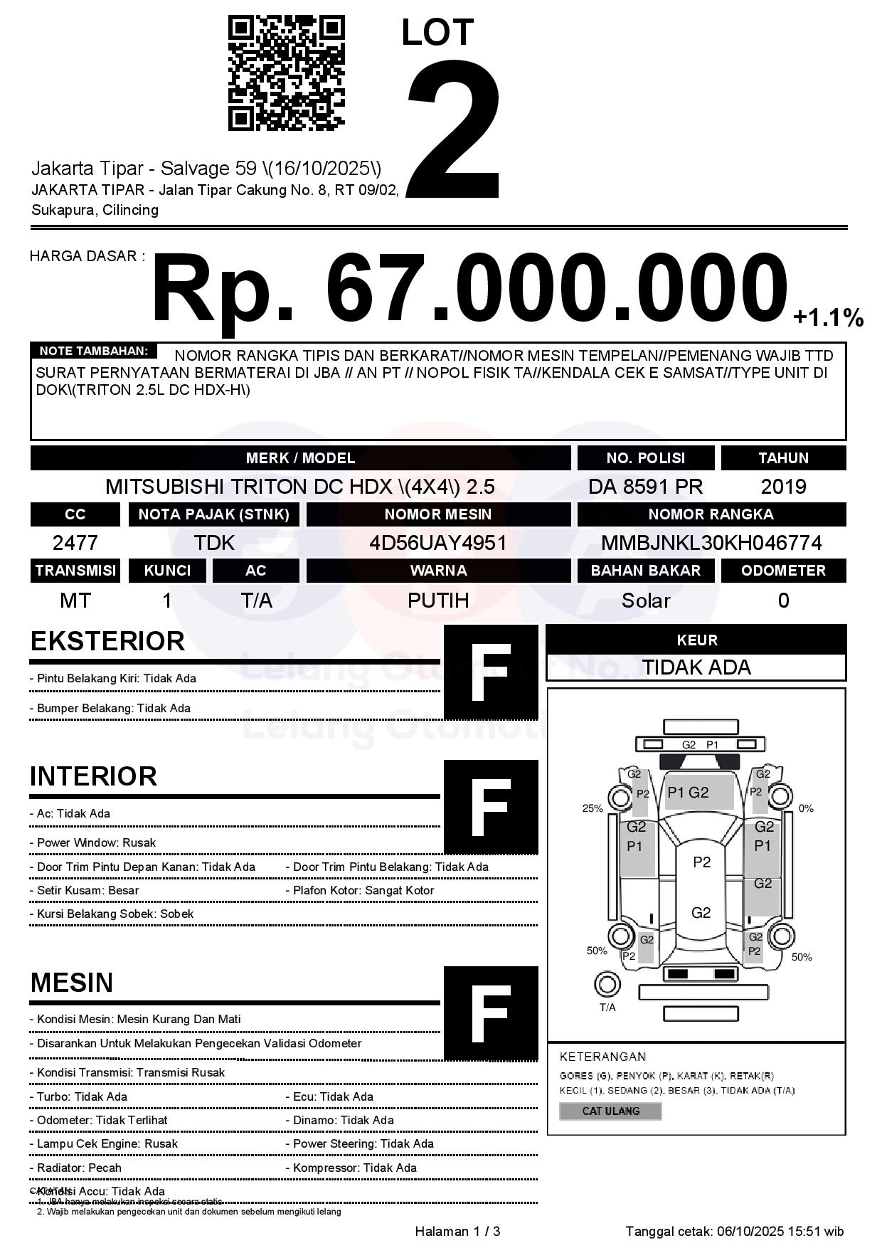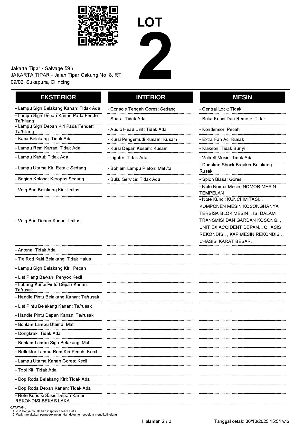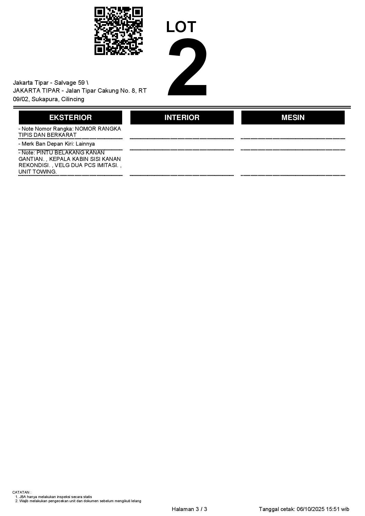 - Kondisi objek lelang dilelang apa adanya, baik kondisi fisik, mesin maupun legalitas kendaraan. Jika terdapat kekurangan/cacat baik yang terlihat maupun yang tidak terlihat, maka semua akan menjadi tanggung jawab/risiko Pemenang Lelang. Oleh karena itu, Pemenang Lelang melepaskan segala hak untuk menuntut dan/atau meminta ganti rugi atas hal tersebut kepada JBA.