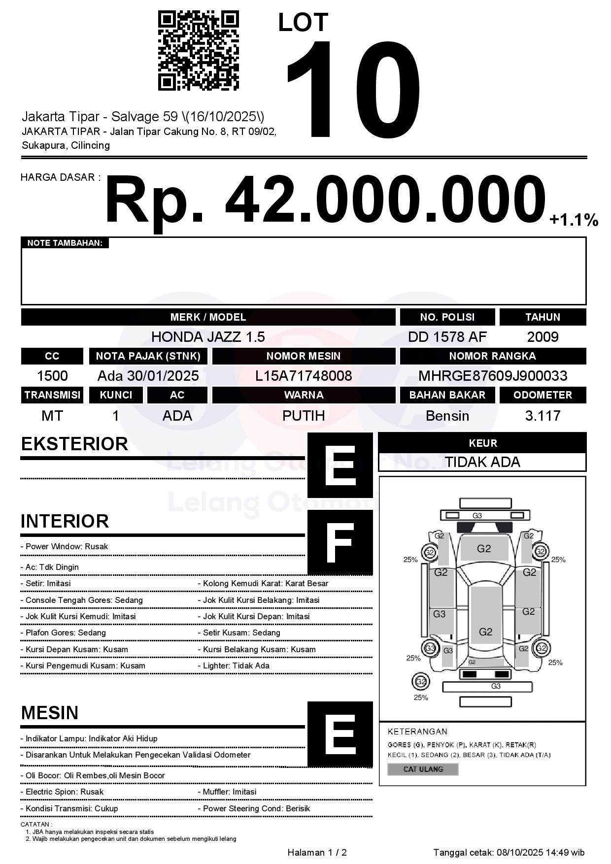- Kondisi objek lelang dilelang apa adanya, baik kondisi fisik, mesin maupun legalitas kendaraan. Jika terdapat kekurangan/cacat baik yang terlihat maupun yang tidak terlihat, maka semua akan menjadi tanggung jawab/risiko Pemenang Lelang. Oleh karena itu, Pemenang Lelang melepaskan segala hak untuk menuntut dan/atau meminta ganti rugi atas hal tersebut kepada JBA.