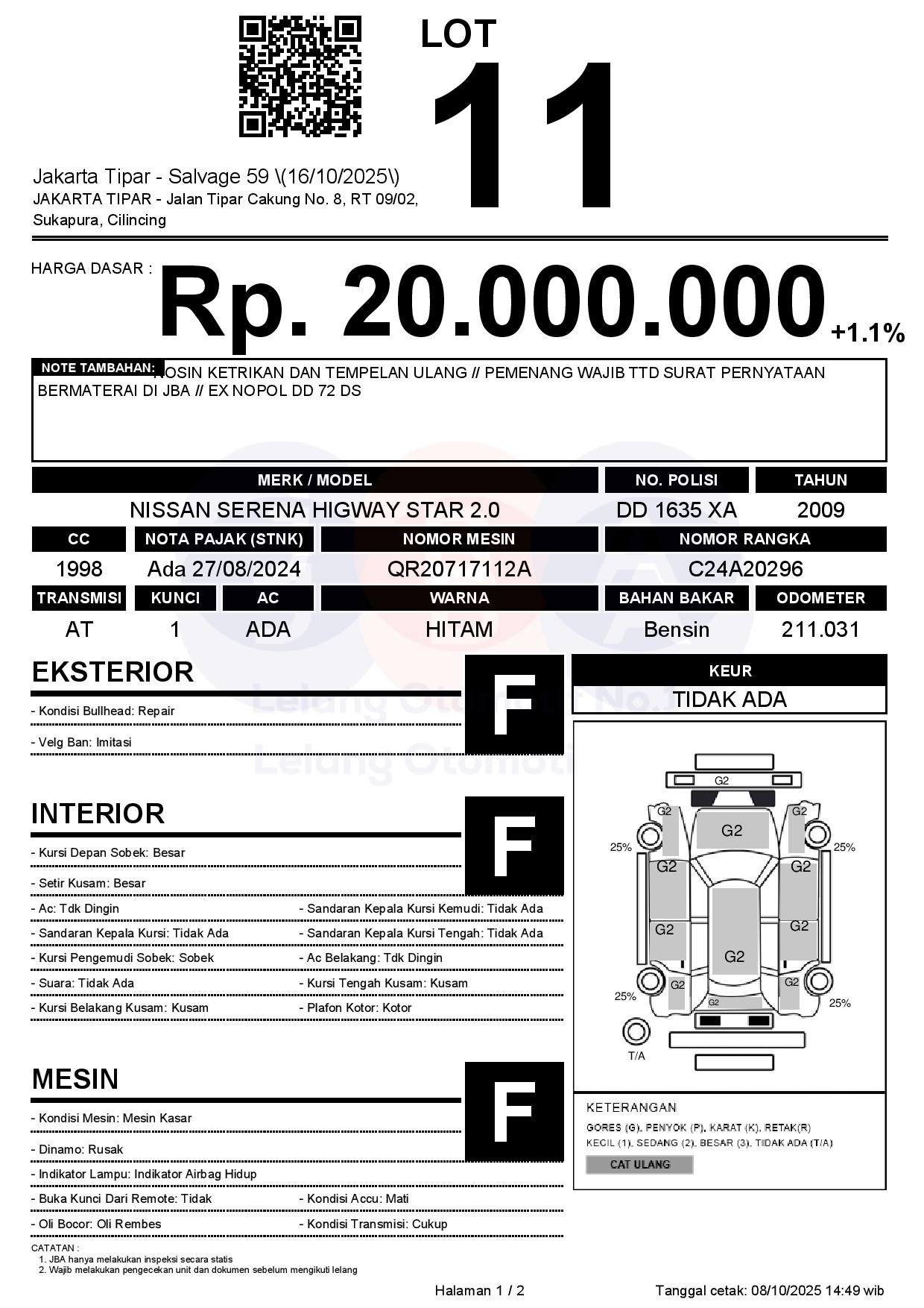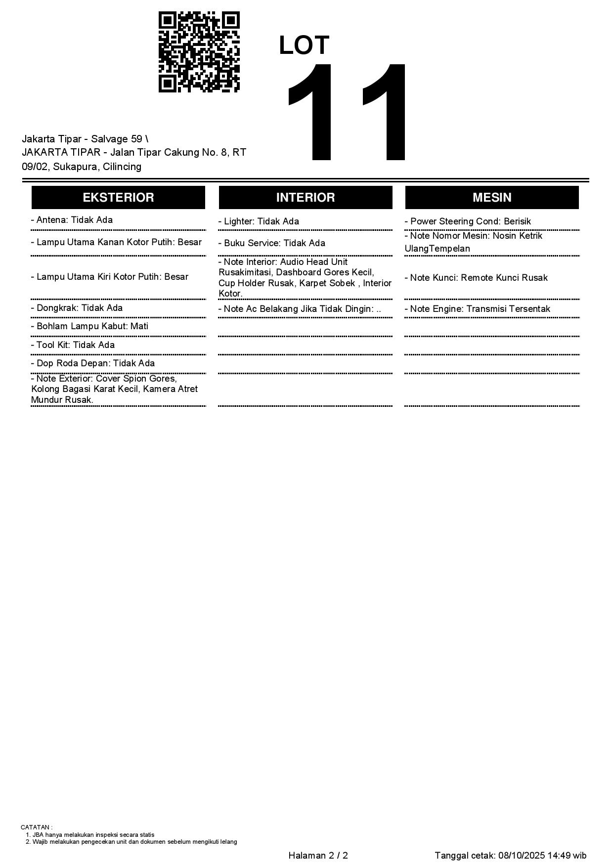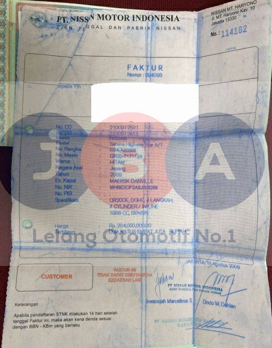 - Kondisi objek lelang dilelang apa adanya, baik kondisi fisik, mesin maupun legalitas kendaraan. Jika terdapat kekurangan/cacat baik yang terlihat maupun yang tidak terlihat, maka semua akan menjadi tanggung jawab/risiko Pemenang Lelang. Oleh karena itu, Pemenang Lelang melepaskan segala hak untuk menuntut dan/atau meminta ganti rugi atas hal tersebut kepada JBA.