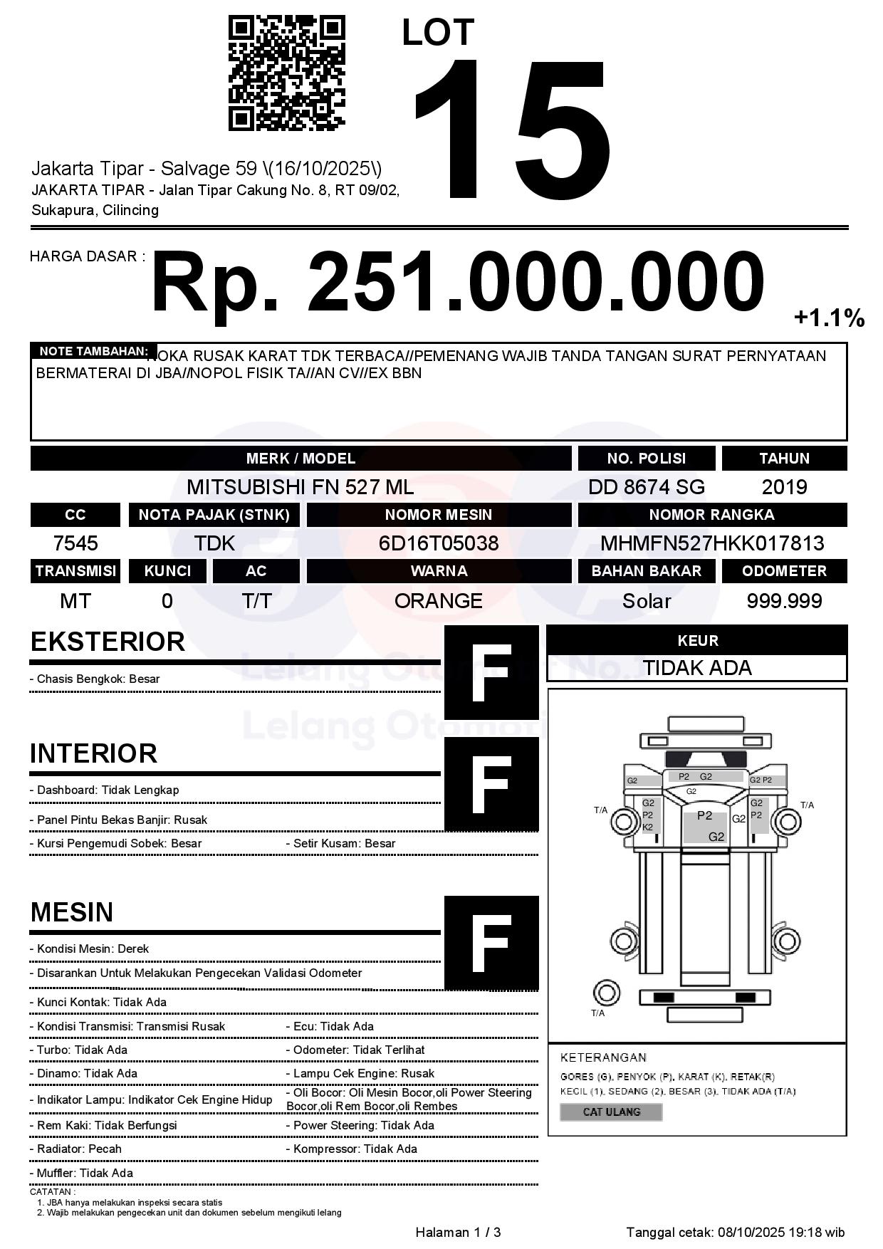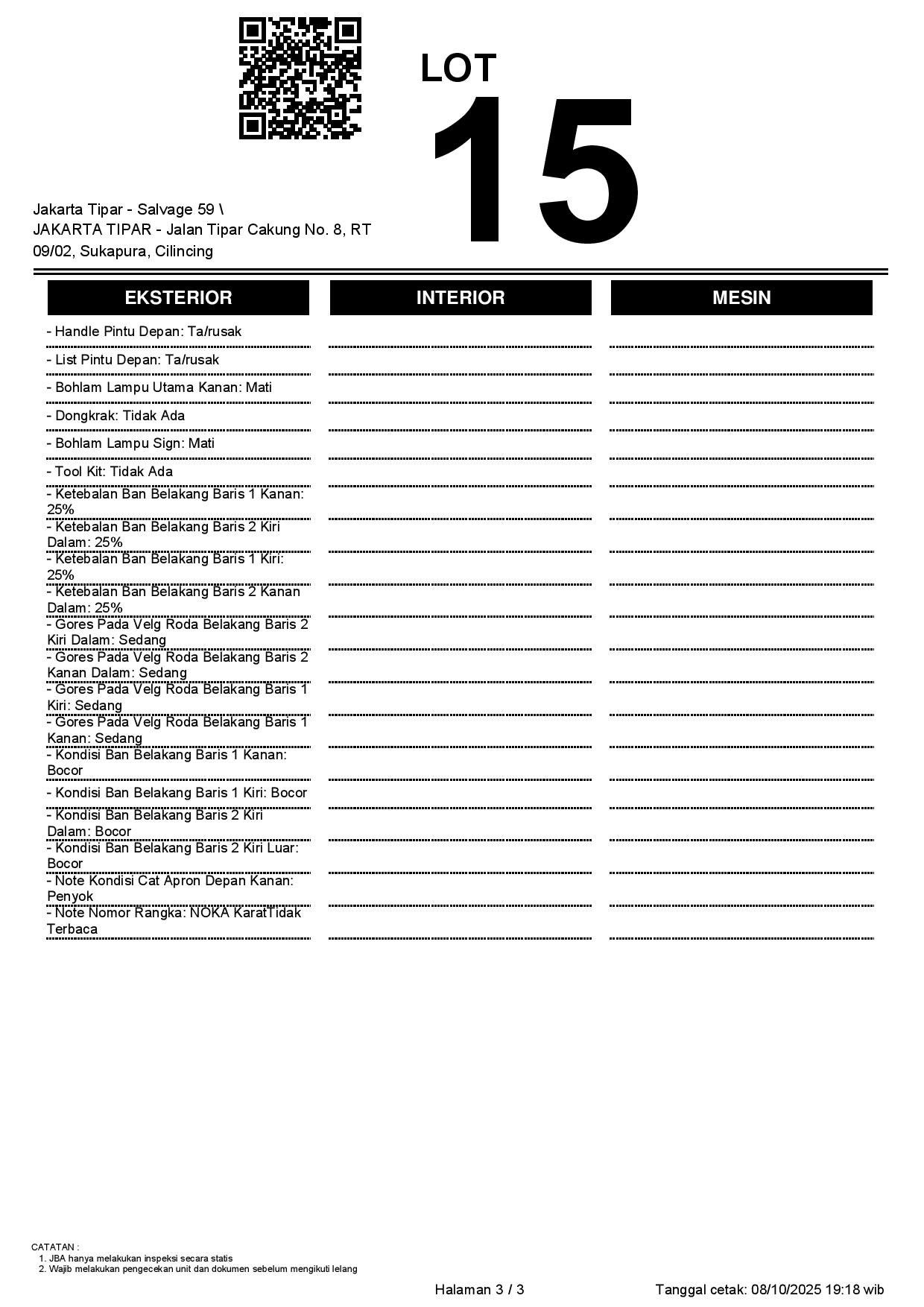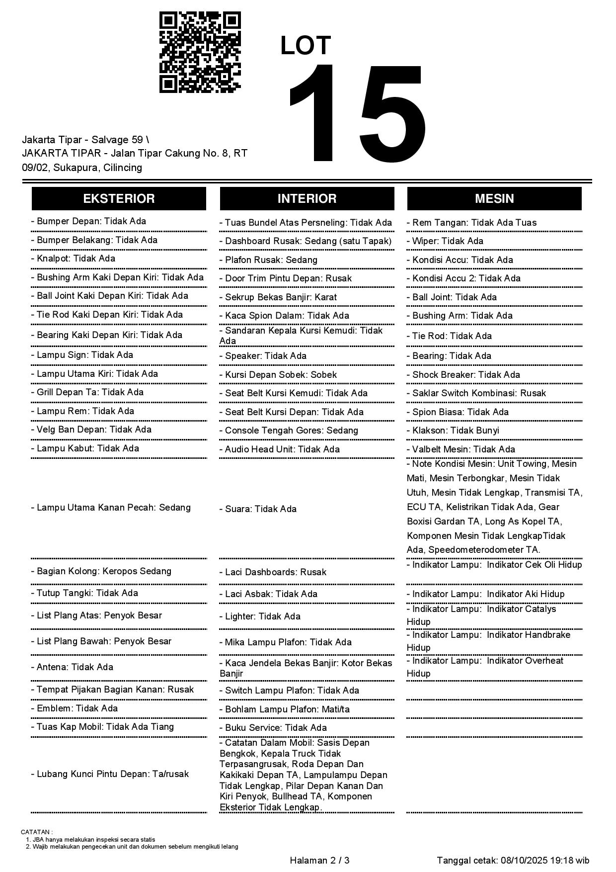 - Kondisi objek lelang dilelang apa adanya, baik kondisi fisik, mesin maupun legalitas kendaraan. Jika terdapat kekurangan/cacat baik yang terlihat maupun yang tidak terlihat, maka semua akan menjadi tanggung jawab/risiko Pemenang Lelang. Oleh karena itu, Pemenang Lelang melepaskan segala hak untuk menuntut dan/atau meminta ganti rugi atas hal tersebut kepada JBA.