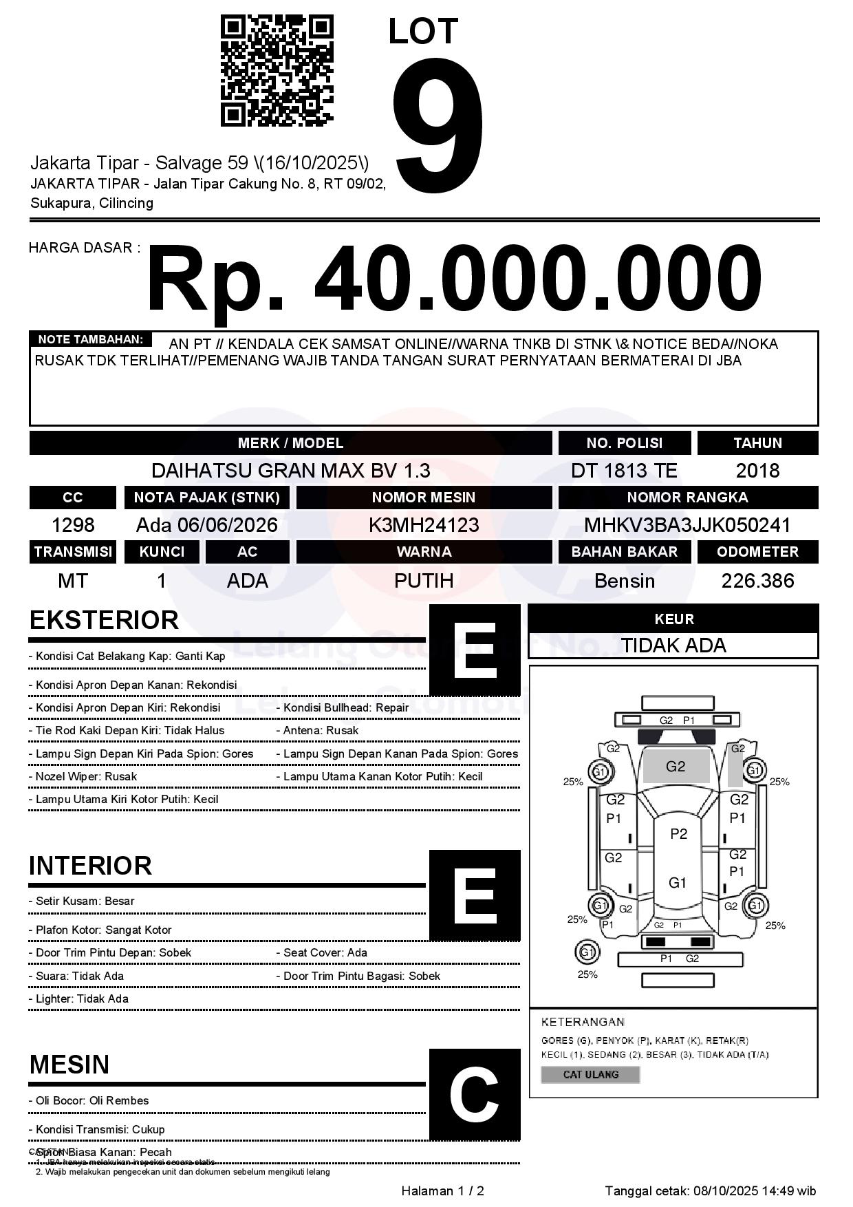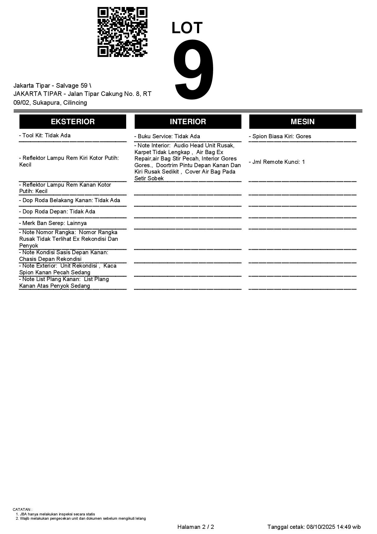 - Kondisi objek lelang dilelang apa adanya, baik kondisi fisik, mesin maupun legalitas kendaraan. Jika terdapat kekurangan/cacat baik yang terlihat maupun yang tidak terlihat, maka semua akan menjadi tanggung jawab/risiko Pemenang Lelang. Oleh karena itu, Pemenang Lelang melepaskan segala hak untuk menuntut dan/atau meminta ganti rugi atas hal tersebut kepada JBA.