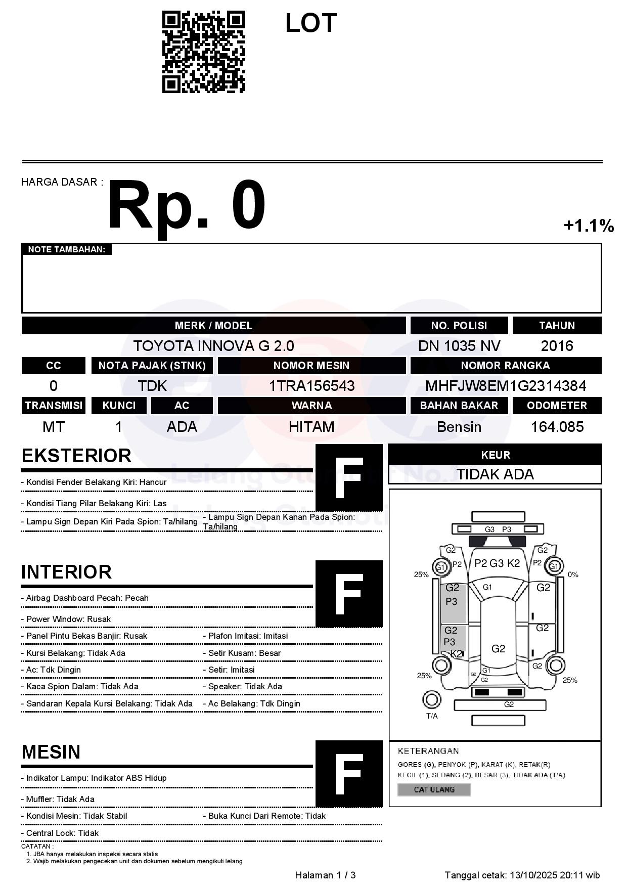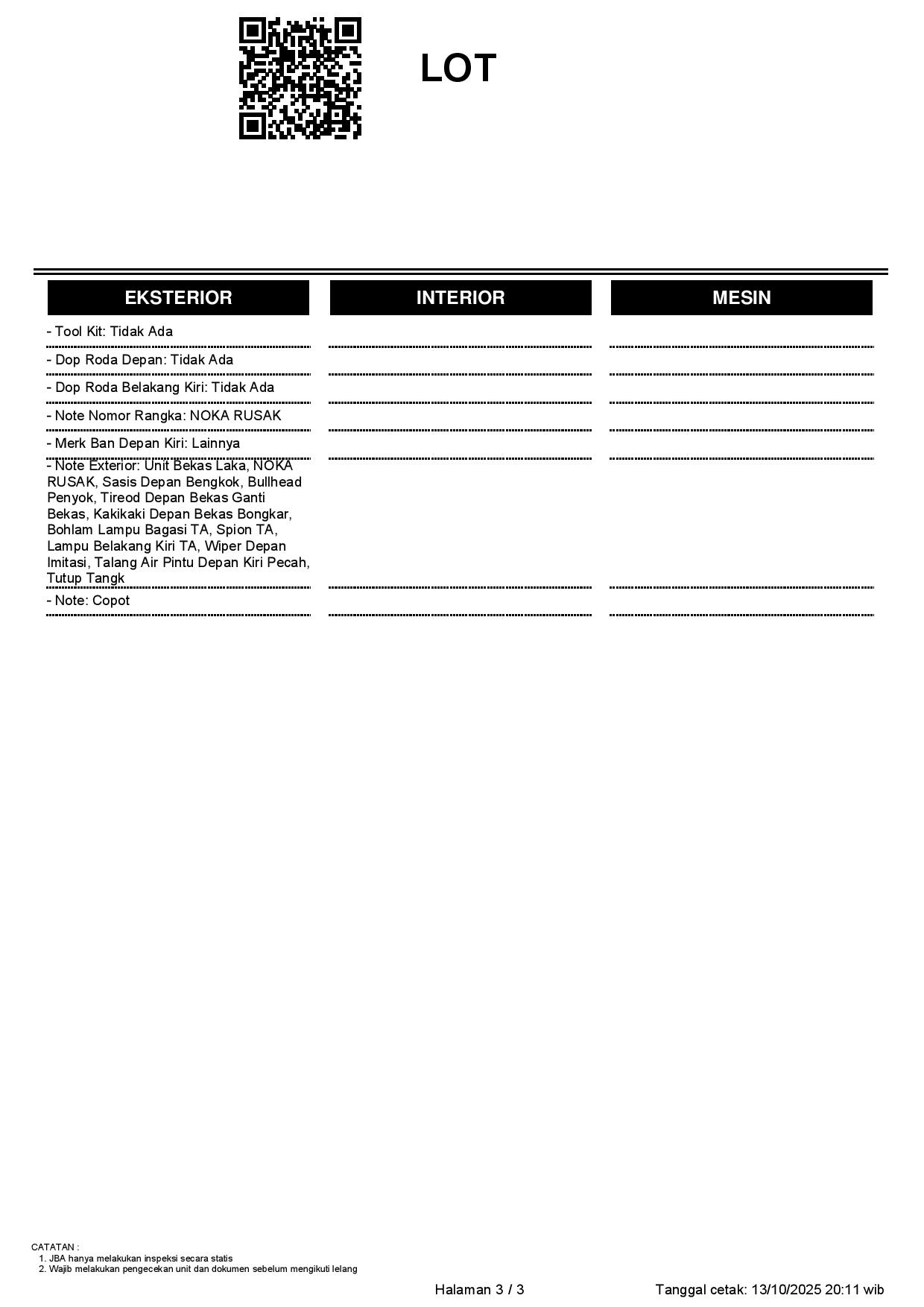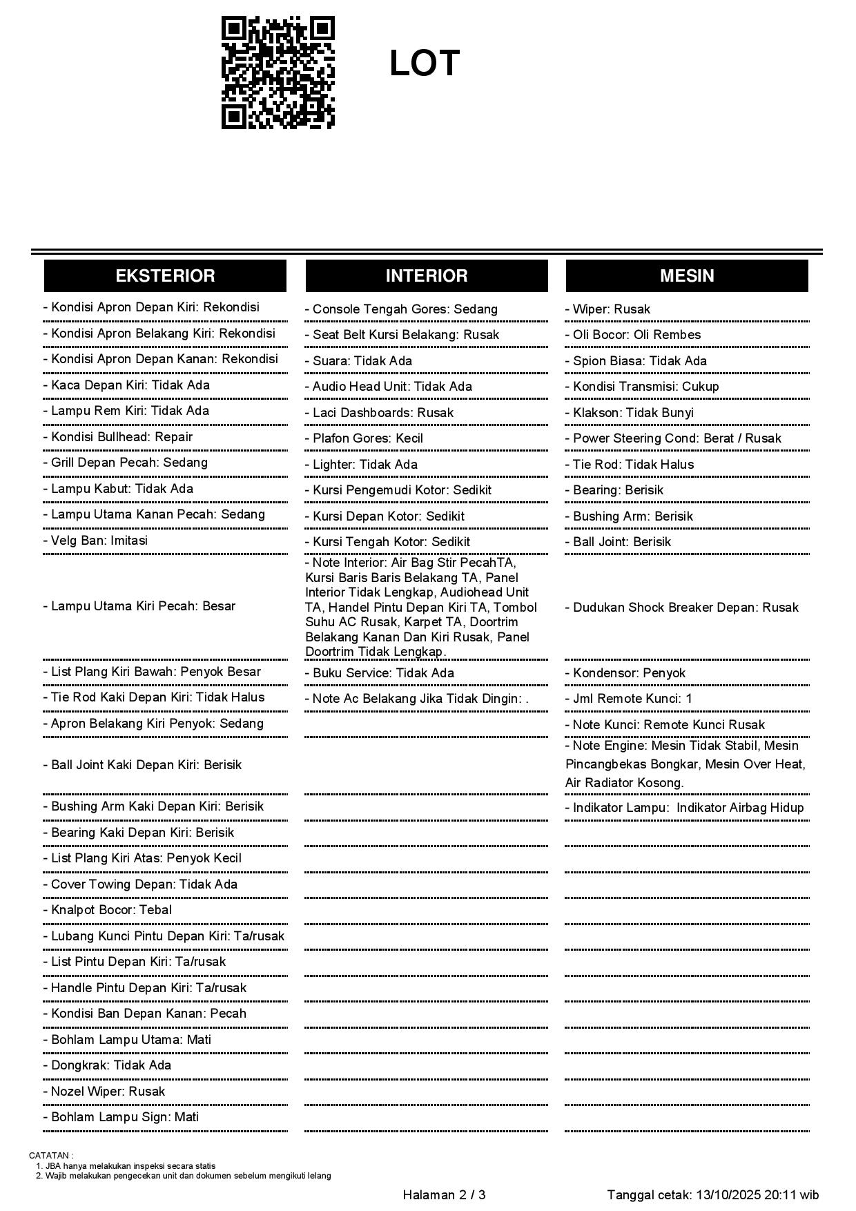- Kondisi objek lelang dilelang apa adanya, baik kondisi fisik, mesin maupun legalitas kendaraan. Jika terdapat kekurangan/cacat baik yang terlihat maupun yang tidak terlihat, maka semua akan menjadi tanggung jawab/risiko Pemenang Lelang. Oleh karena itu, Pemenang Lelang melepaskan segala hak untuk menuntut dan/atau meminta ganti rugi atas hal tersebut kepada JBA.