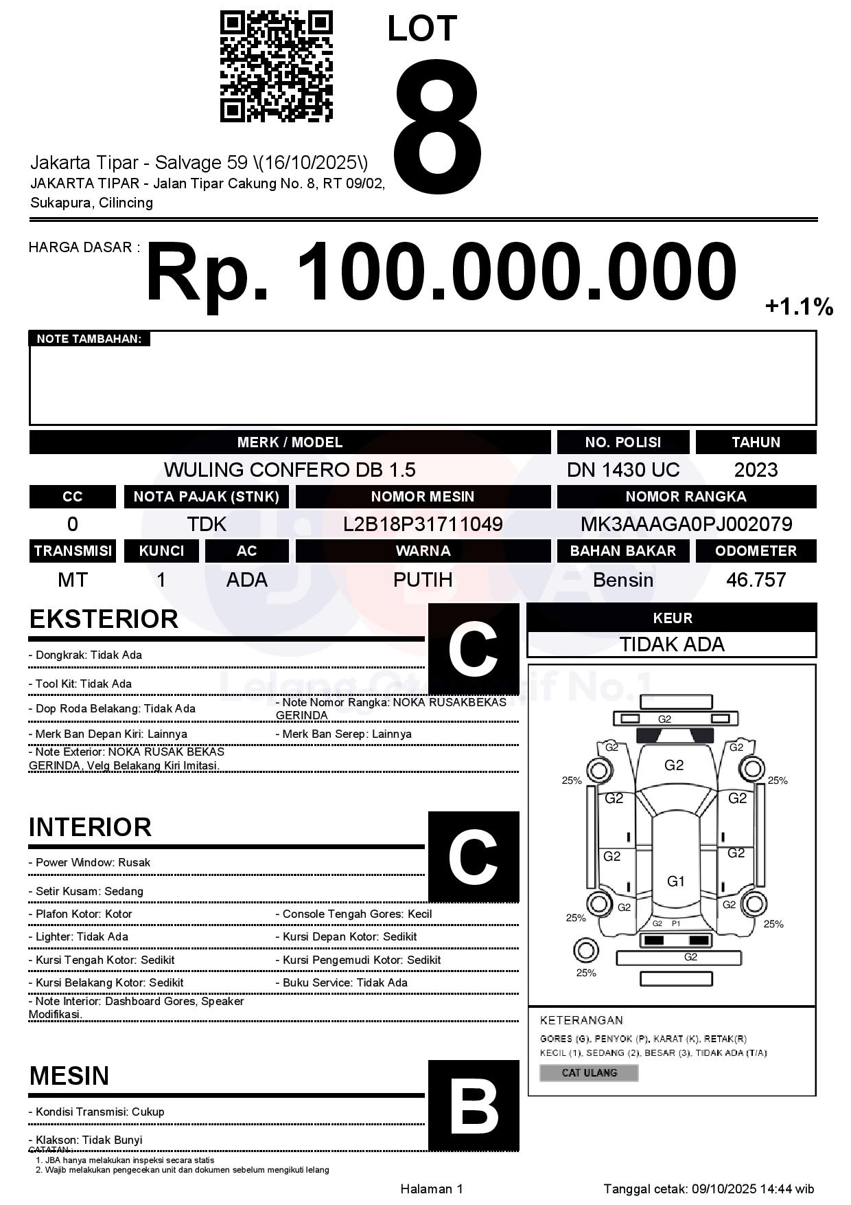 - Kondisi objek lelang dilelang apa adanya, baik kondisi fisik, mesin maupun legalitas kendaraan. Jika terdapat kekurangan/cacat baik yang terlihat maupun yang tidak terlihat, maka semua akan menjadi tanggung jawab/risiko Pemenang Lelang. Oleh karena itu, Pemenang Lelang melepaskan segala hak untuk menuntut dan/atau meminta ganti rugi atas hal tersebut kepada JBA.