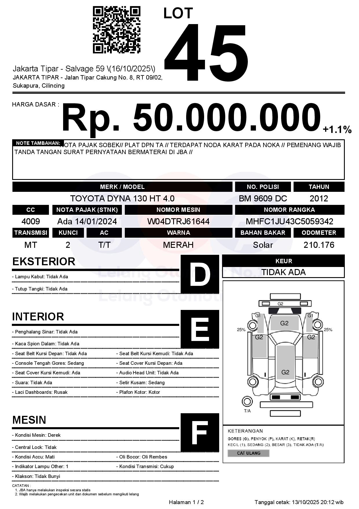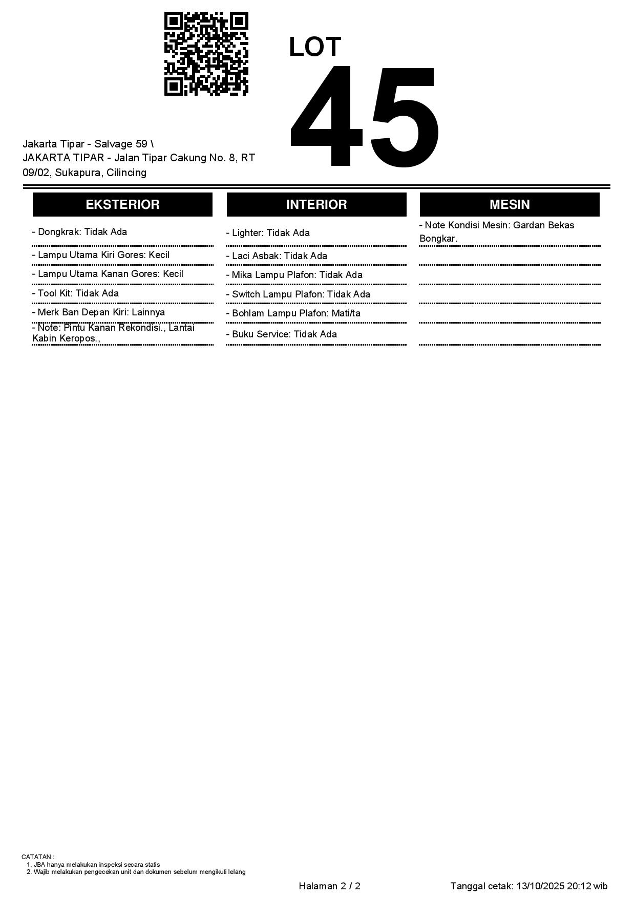 - Kondisi objek lelang dilelang apa adanya, baik kondisi fisik, mesin maupun legalitas kendaraan. Jika terdapat kekurangan/cacat baik yang terlihat maupun yang tidak terlihat, maka semua akan menjadi tanggung jawab/risiko Pemenang Lelang. Oleh karena itu, Pemenang Lelang melepaskan segala hak untuk menuntut dan/atau meminta ganti rugi atas hal tersebut kepada JBA.