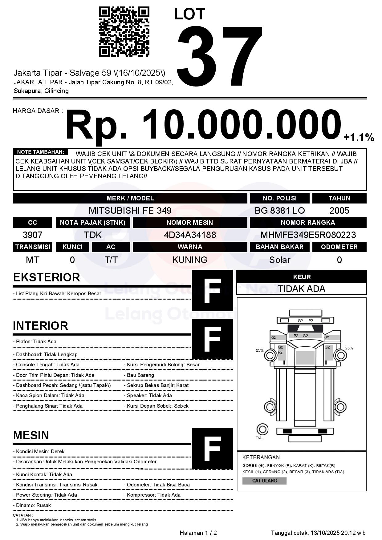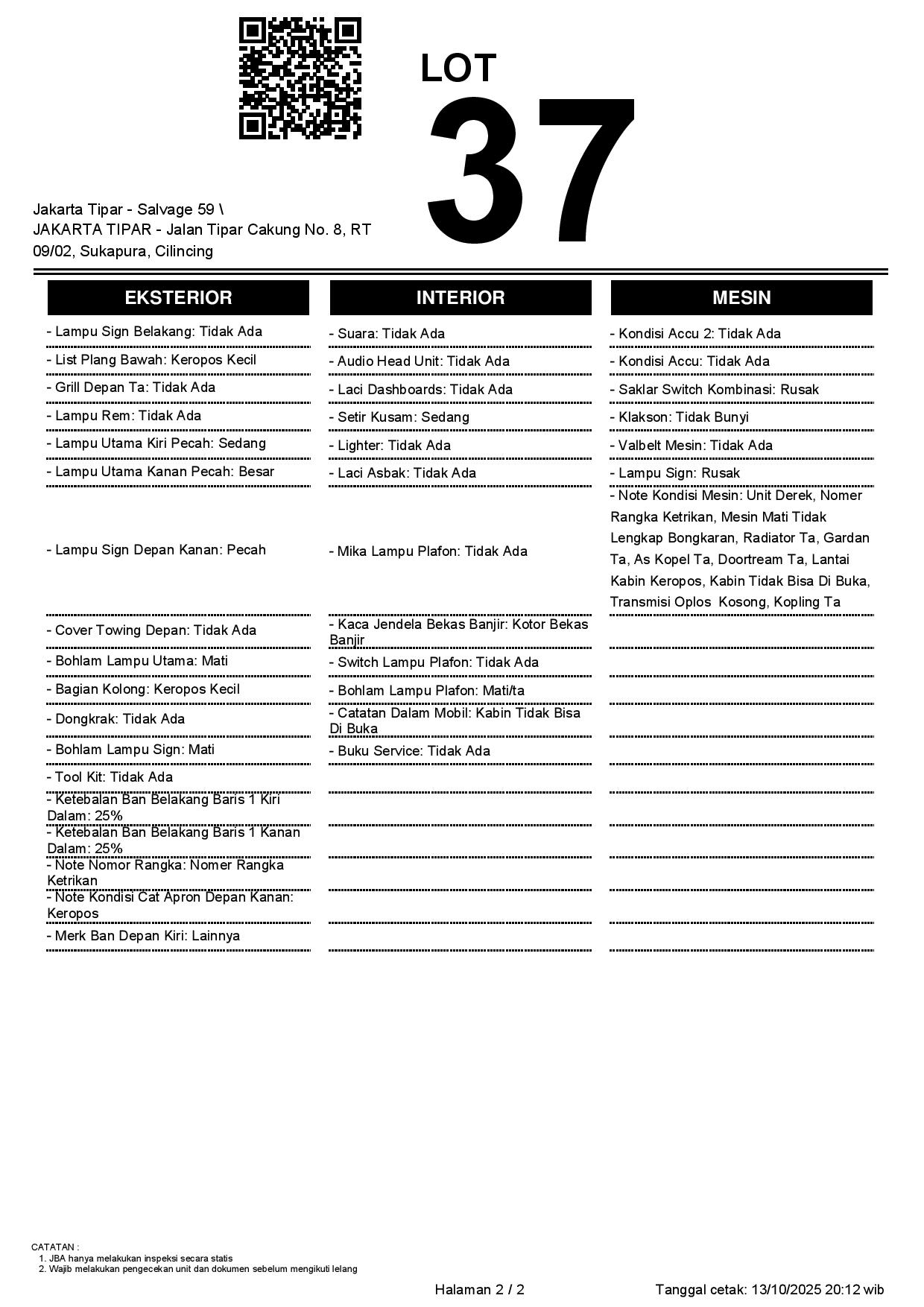 - Kondisi objek lelang dilelang apa adanya, baik kondisi fisik, mesin maupun legalitas kendaraan. Jika terdapat kekurangan/cacat baik yang terlihat maupun yang tidak terlihat, maka semua akan menjadi tanggung jawab/risiko Pemenang Lelang. Oleh karena itu, Pemenang Lelang melepaskan segala hak untuk menuntut dan/atau meminta ganti rugi atas hal tersebut kepada JBA.