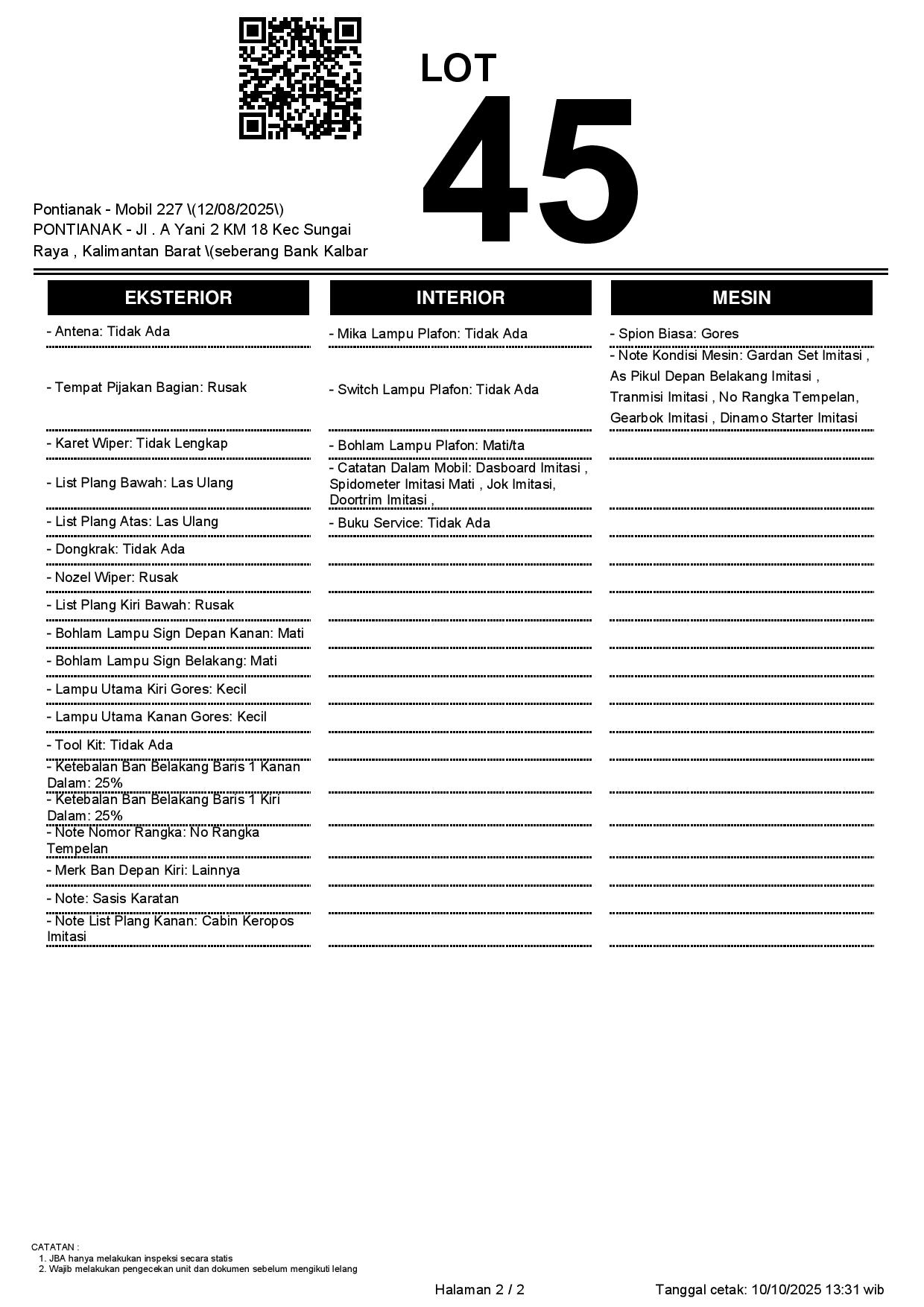 - Kondisi objek lelang dilelang apa adanya, baik kondisi fisik, mesin maupun legalitas kendaraan. Jika terdapat kekurangan/cacat baik yang terlihat maupun yang tidak terlihat, maka semua akan menjadi tanggung jawab/risiko Pemenang Lelang. Oleh karena itu, Pemenang Lelang melepaskan segala hak untuk menuntut dan/atau meminta ganti rugi atas hal tersebut kepada JBA.