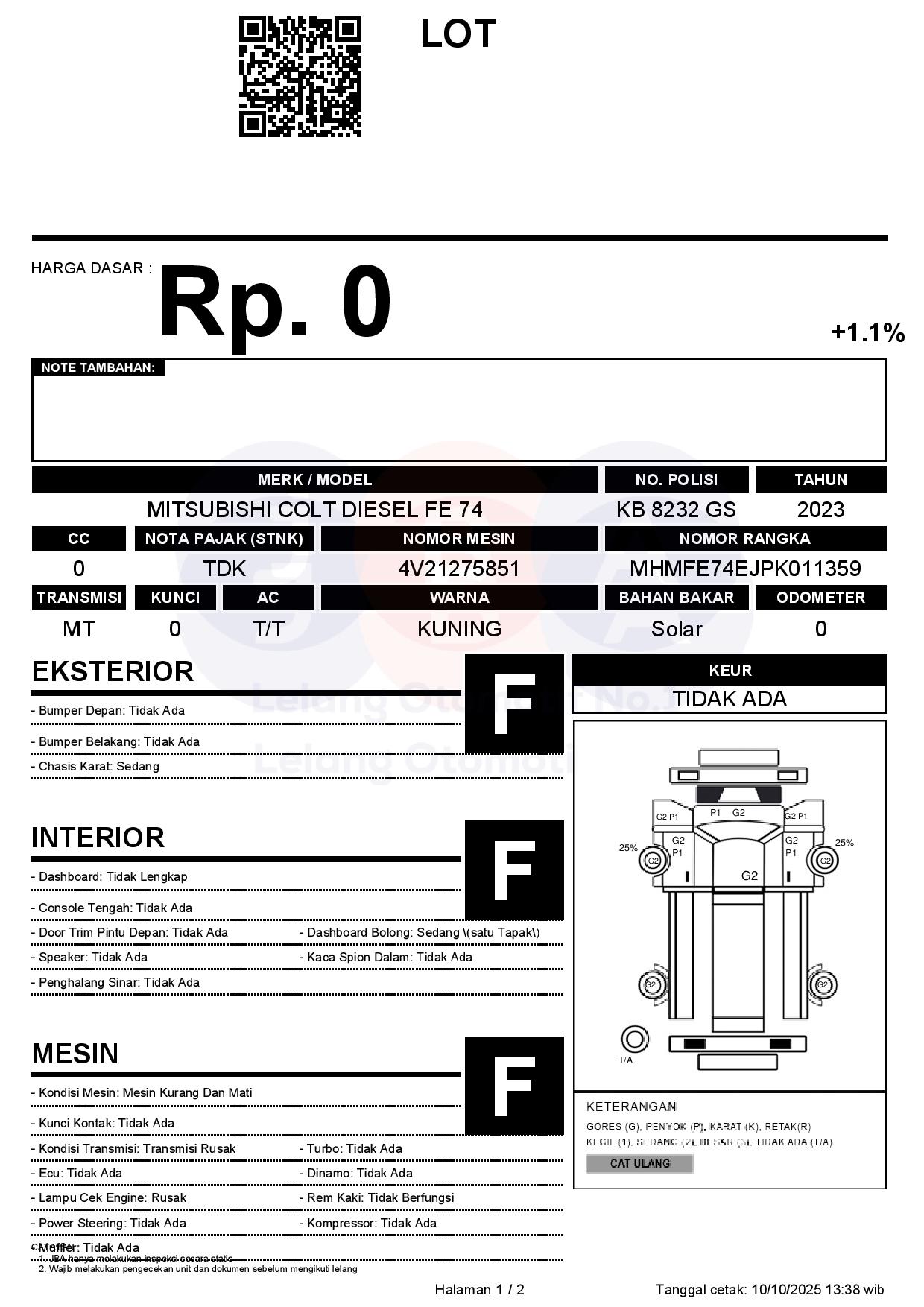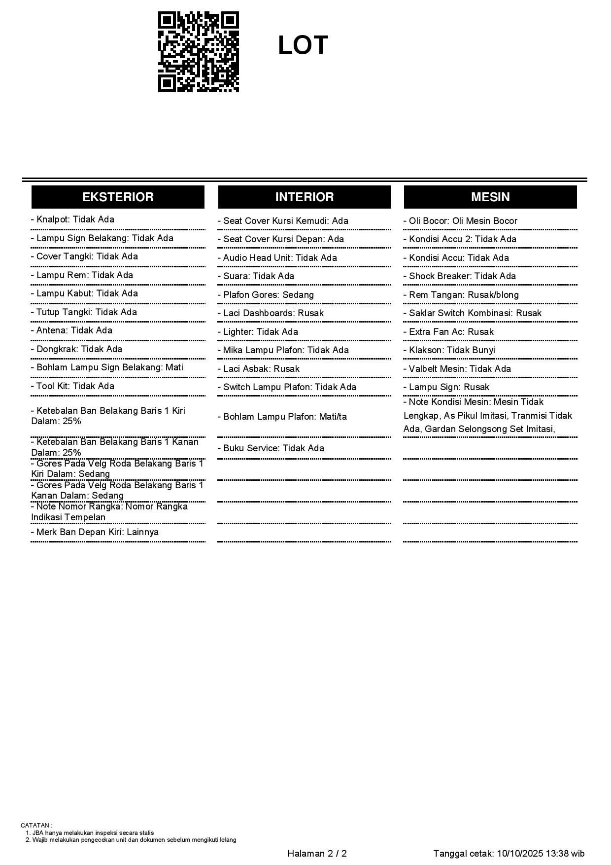 - Kondisi objek lelang dilelang apa adanya, baik kondisi fisik, mesin maupun legalitas kendaraan. Jika terdapat kekurangan/cacat baik yang terlihat maupun yang tidak terlihat, maka semua akan menjadi tanggung jawab/risiko Pemenang Lelang. Oleh karena itu, Pemenang Lelang melepaskan segala hak untuk menuntut dan/atau meminta ganti rugi atas hal tersebut kepada JBA.