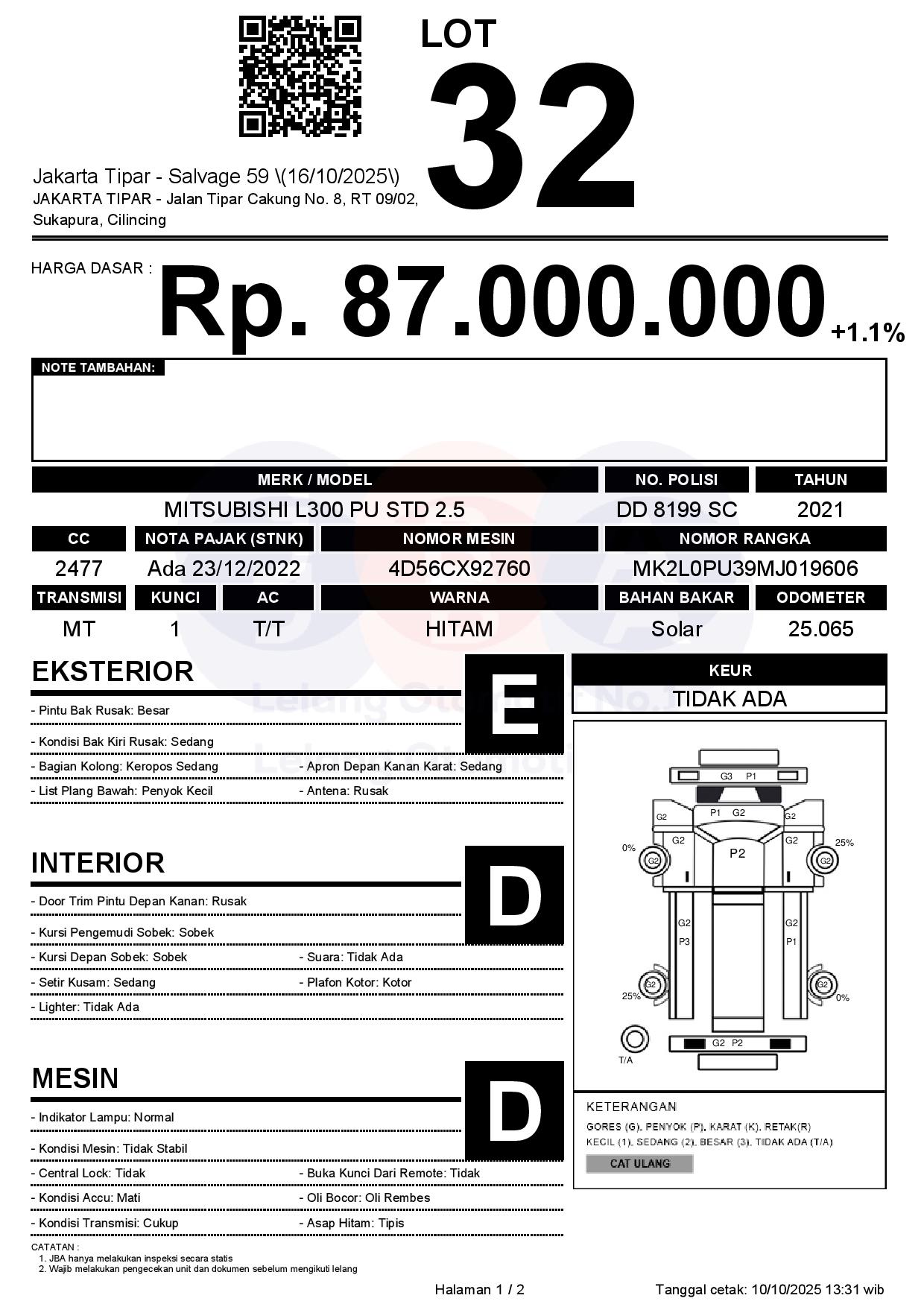 - Kondisi objek lelang dilelang apa adanya, baik kondisi fisik, mesin maupun legalitas kendaraan. Jika terdapat kekurangan/cacat baik yang terlihat maupun yang tidak terlihat, maka semua akan menjadi tanggung jawab/risiko Pemenang Lelang. Oleh karena itu, Pemenang Lelang melepaskan segala hak untuk menuntut dan/atau meminta ganti rugi atas hal tersebut kepada JBA.