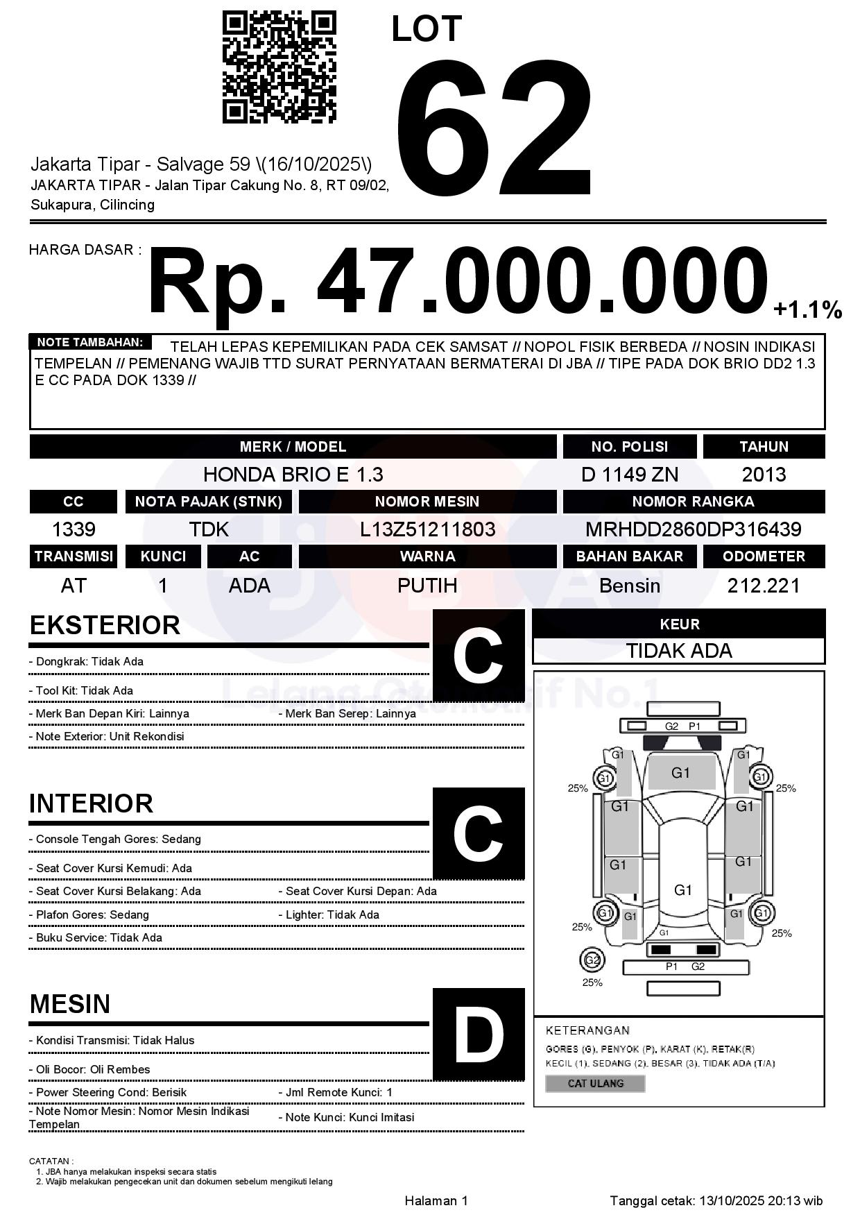 - Kondisi objek lelang dilelang apa adanya, baik kondisi fisik, mesin maupun legalitas kendaraan. Jika terdapat kekurangan/cacat baik yang terlihat maupun yang tidak terlihat, maka semua akan menjadi tanggung jawab/risiko Pemenang Lelang. Oleh karena itu, Pemenang Lelang melepaskan segala hak untuk menuntut dan/atau meminta ganti rugi atas hal tersebut kepada JBA.