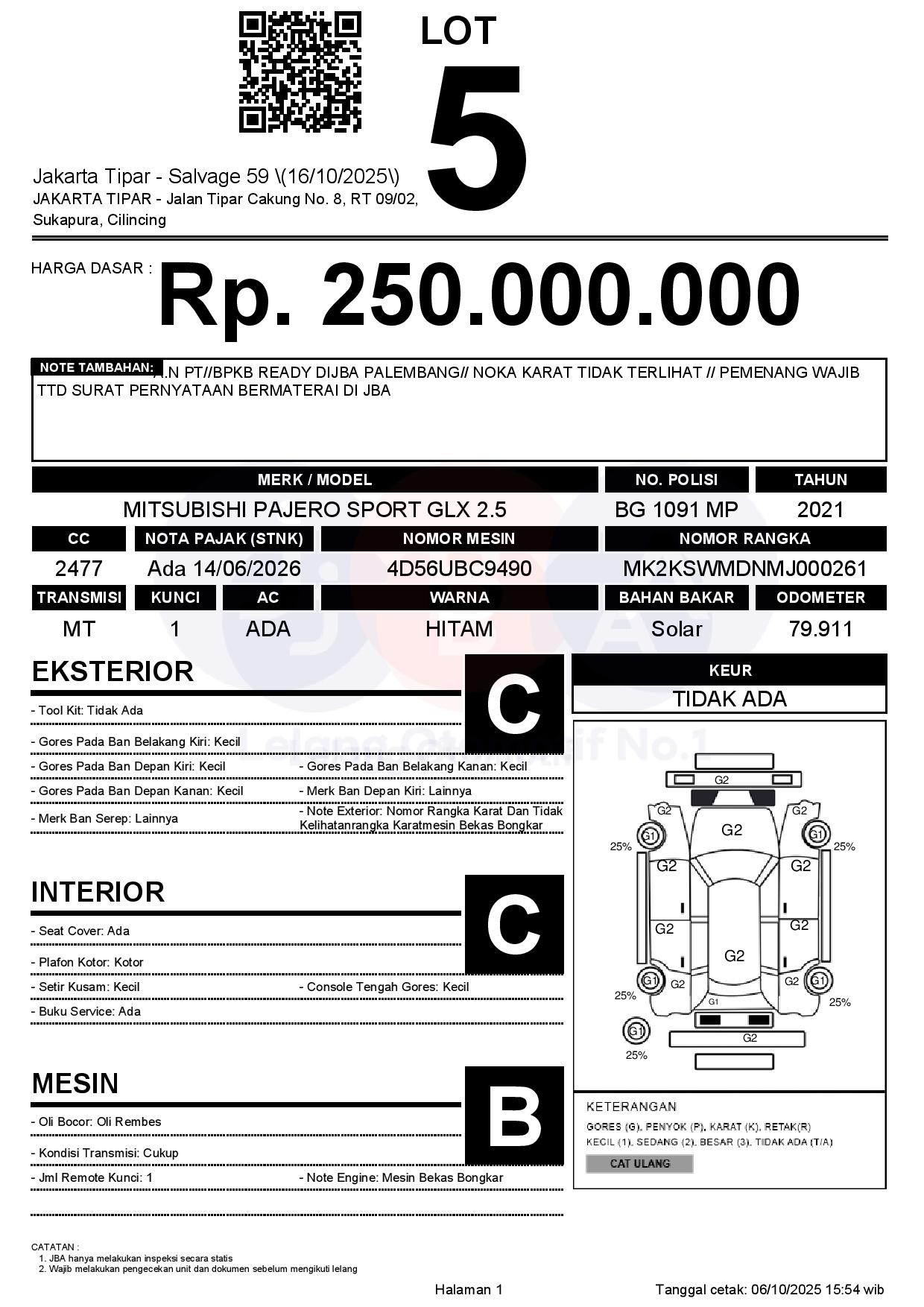 - Kondisi objek lelang dilelang apa adanya, baik kondisi fisik, mesin maupun legalitas kendaraan. Jika terdapat kekurangan/cacat baik yang terlihat maupun yang tidak terlihat, maka semua akan menjadi tanggung jawab/risiko Pemenang Lelang. Oleh karena itu, Pemenang Lelang melepaskan segala hak untuk menuntut dan/atau meminta ganti rugi atas hal tersebut kepada JBA.