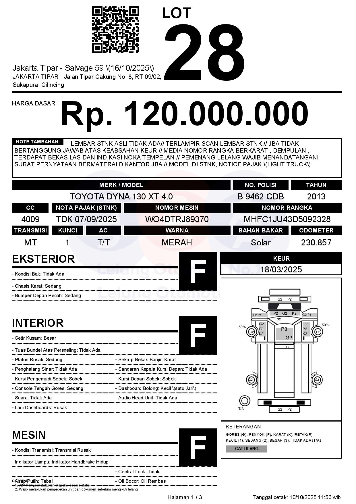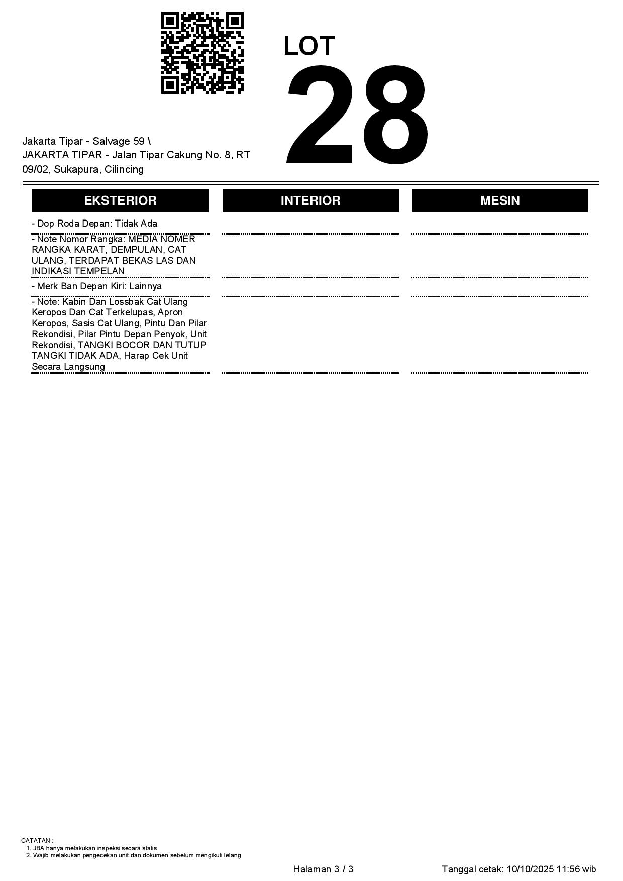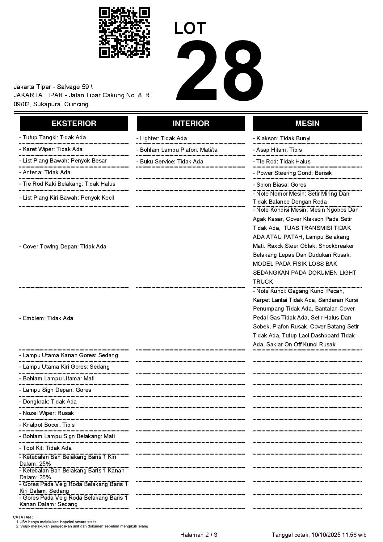- Kondisi objek lelang dilelang apa adanya, baik kondisi fisik, mesin maupun legalitas kendaraan. Jika terdapat kekurangan/cacat baik yang terlihat maupun yang tidak terlihat, maka semua akan menjadi tanggung jawab/risiko Pemenang Lelang. Oleh karena itu, Pemenang Lelang melepaskan segala hak untuk menuntut dan/atau meminta ganti rugi atas hal tersebut kepada JBA.