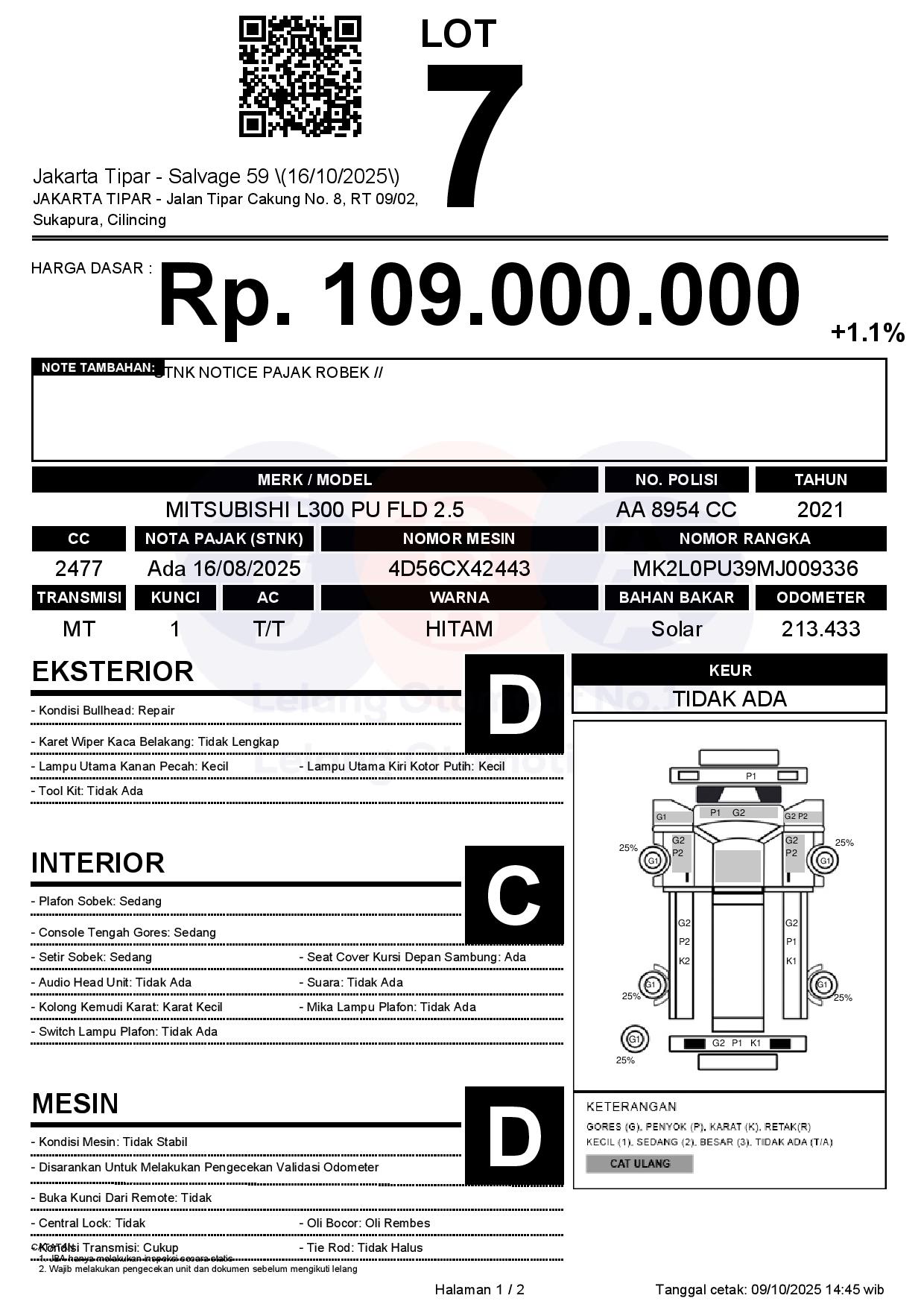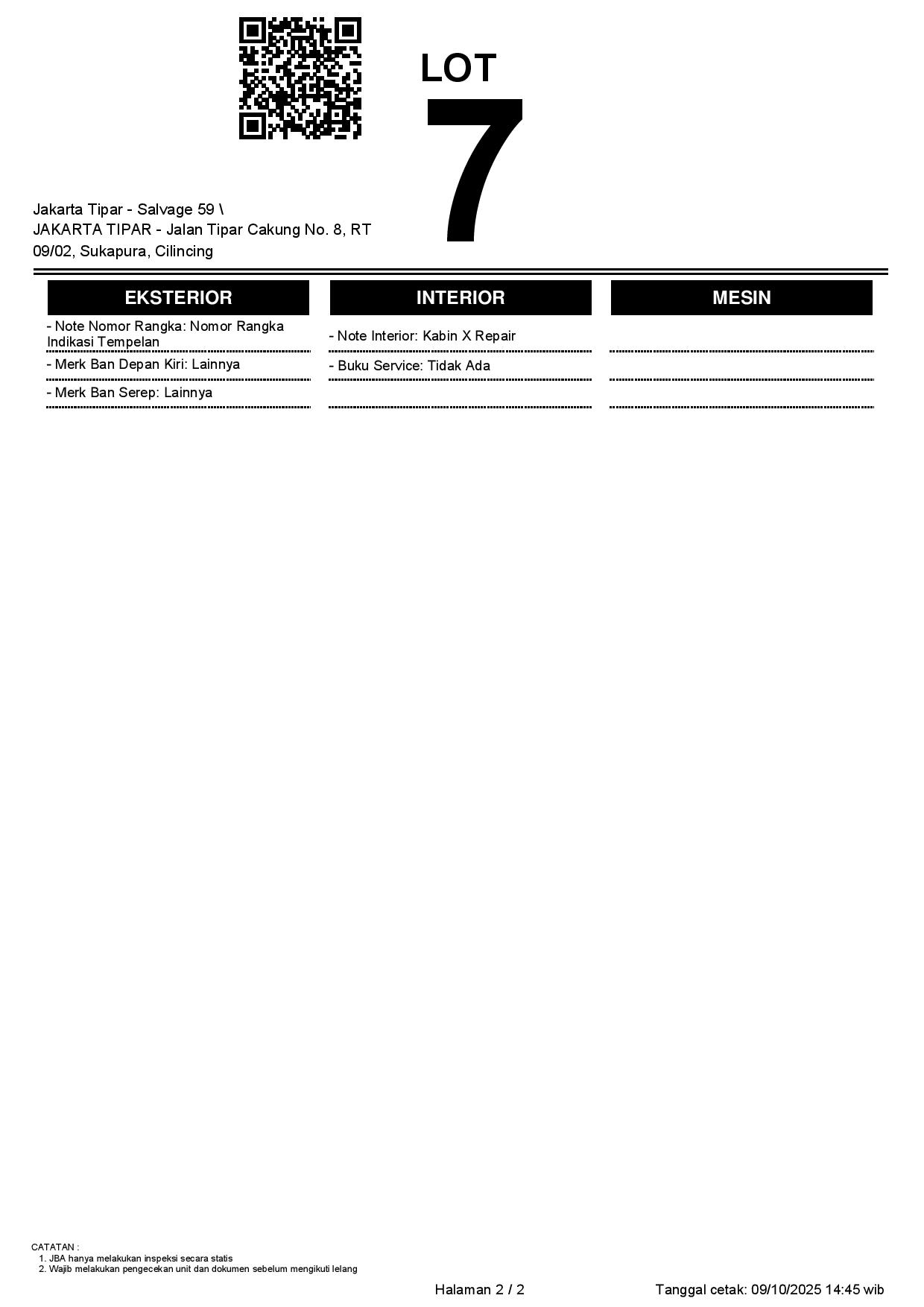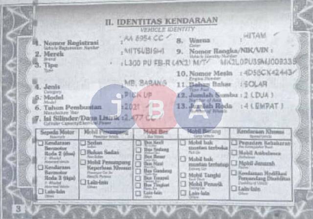- Kondisi objek lelang dilelang apa adanya, baik kondisi fisik, mesin maupun legalitas kendaraan. Jika terdapat kekurangan/cacat baik yang terlihat maupun yang tidak terlihat, maka semua akan menjadi tanggung jawab/risiko Pemenang Lelang. Oleh karena itu, Pemenang Lelang melepaskan segala hak untuk menuntut dan/atau meminta ganti rugi atas hal tersebut kepada JBA.