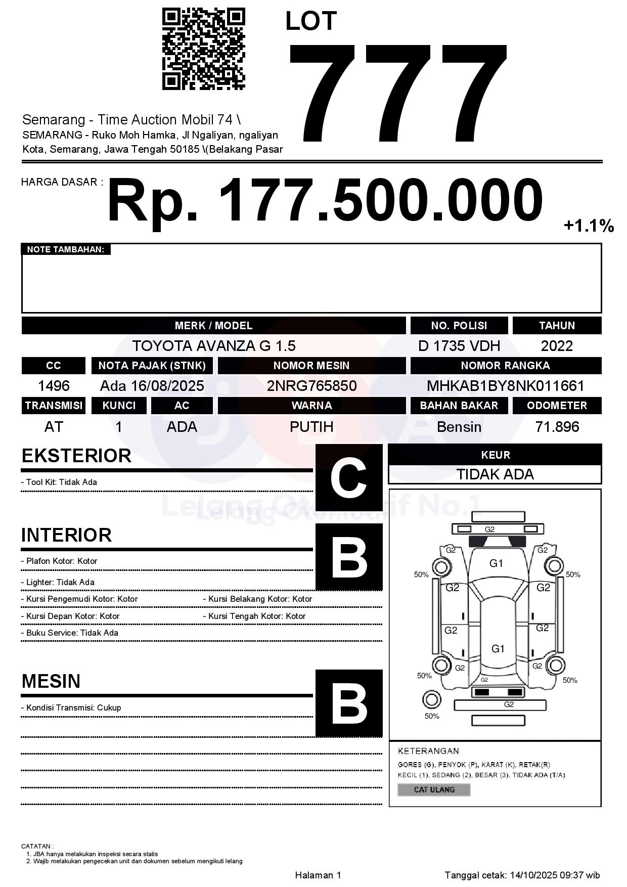 - Kondisi objek lelang dilelang apa adanya, baik kondisi fisik, mesin maupun legalitas kendaraan. Jika terdapat kekurangan/cacat baik yang terlihat maupun yang tidak terlihat, maka semua akan menjadi tanggung jawab/risiko Pemenang Lelang. Oleh karena itu, Pemenang Lelang melepaskan segala hak untuk menuntut dan/atau meminta ganti rugi atas hal tersebut kepada JBA.