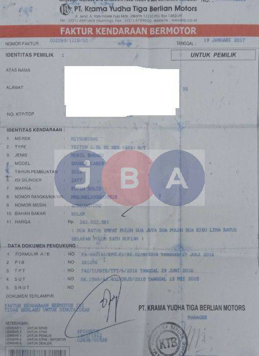 - Kondisi objek lelang dilelang apa adanya, baik kondisi fisik, mesin maupun legalitas kendaraan. Jika terdapat kekurangan/cacat baik yang terlihat maupun yang tidak terlihat, maka semua akan menjadi tanggung jawab/risiko Pemenang Lelang. Oleh karena itu, Pemenang Lelang melepaskan segala hak untuk menuntut dan/atau meminta ganti rugi atas hal tersebut kepada JBA.