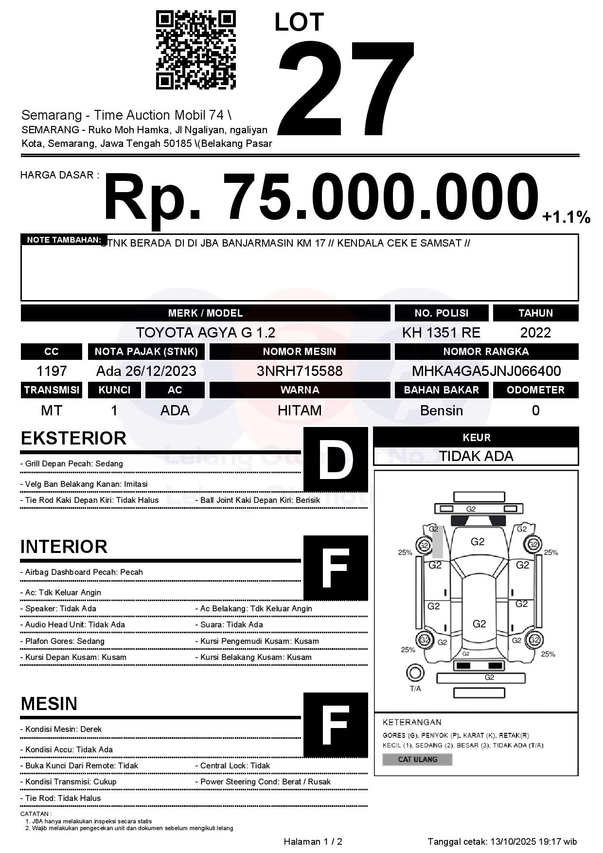 - Kondisi objek lelang dilelang apa adanya, baik kondisi fisik, mesin maupun legalitas kendaraan. Jika terdapat kekurangan/cacat baik yang terlihat maupun yang tidak terlihat, maka semua akan menjadi tanggung jawab/risiko Pemenang Lelang. Oleh karena itu, Pemenang Lelang melepaskan segala hak untuk menuntut dan/atau meminta ganti rugi atas hal tersebut kepada JBA.