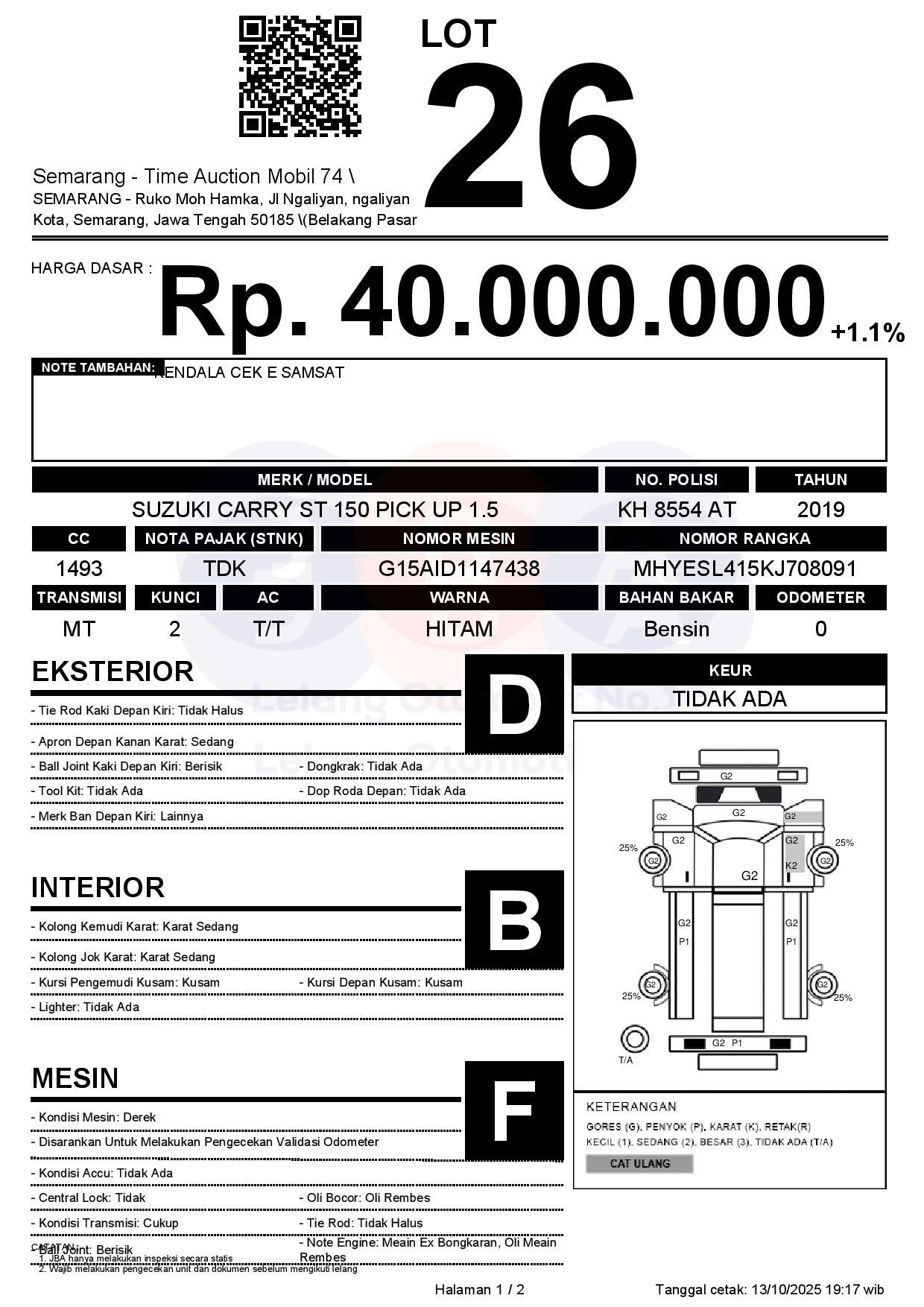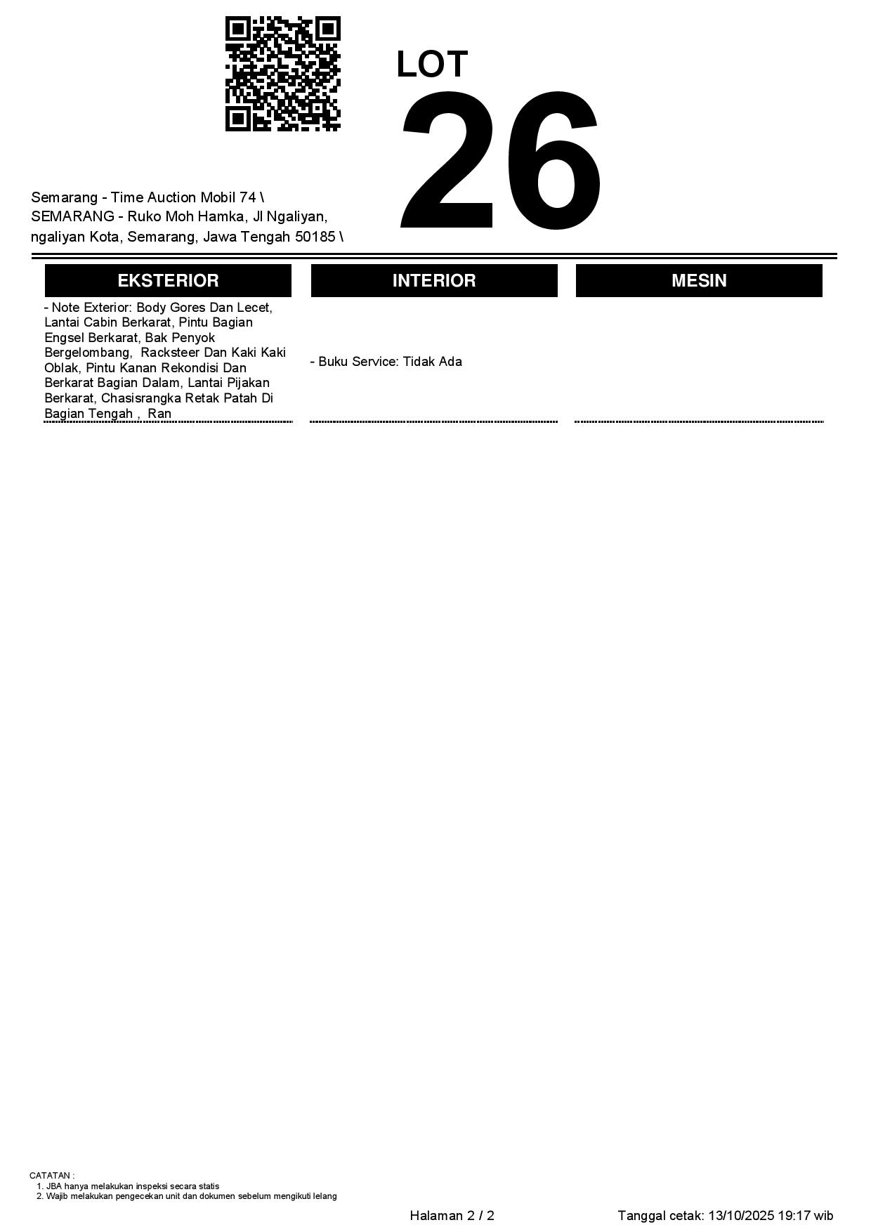 - Kondisi objek lelang dilelang apa adanya, baik kondisi fisik, mesin maupun legalitas kendaraan. Jika terdapat kekurangan/cacat baik yang terlihat maupun yang tidak terlihat, maka semua akan menjadi tanggung jawab/risiko Pemenang Lelang. Oleh karena itu, Pemenang Lelang melepaskan segala hak untuk menuntut dan/atau meminta ganti rugi atas hal tersebut kepada JBA.