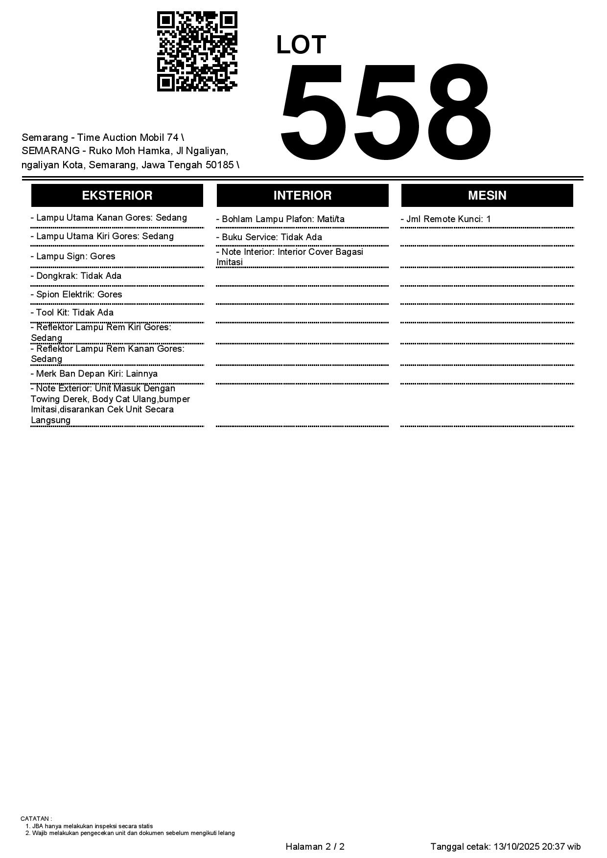 - Kondisi objek lelang dilelang apa adanya, baik kondisi fisik, mesin maupun legalitas kendaraan. Jika terdapat kekurangan/cacat baik yang terlihat maupun yang tidak terlihat, maka semua akan menjadi tanggung jawab/risiko Pemenang Lelang. Oleh karena itu, Pemenang Lelang melepaskan segala hak untuk menuntut dan/atau meminta ganti rugi atas hal tersebut kepada JBA.