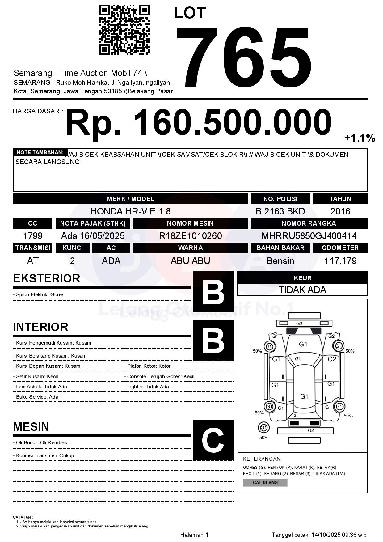 - Kondisi objek lelang dilelang apa adanya, baik kondisi fisik, mesin maupun legalitas kendaraan. Jika terdapat kekurangan/cacat baik yang terlihat maupun yang tidak terlihat, maka semua akan menjadi tanggung jawab/risiko Pemenang Lelang. Oleh karena itu, Pemenang Lelang melepaskan segala hak untuk menuntut dan/atau meminta ganti rugi atas hal tersebut kepada JBA.