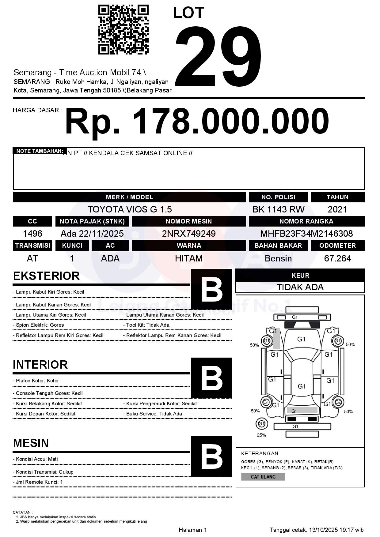 - Kondisi objek lelang dilelang apa adanya, baik kondisi fisik, mesin maupun legalitas kendaraan. Jika terdapat kekurangan/cacat baik yang terlihat maupun yang tidak terlihat, maka semua akan menjadi tanggung jawab/risiko Pemenang Lelang. Oleh karena itu, Pemenang Lelang melepaskan segala hak untuk menuntut dan/atau meminta ganti rugi atas hal tersebut kepada JBA.
