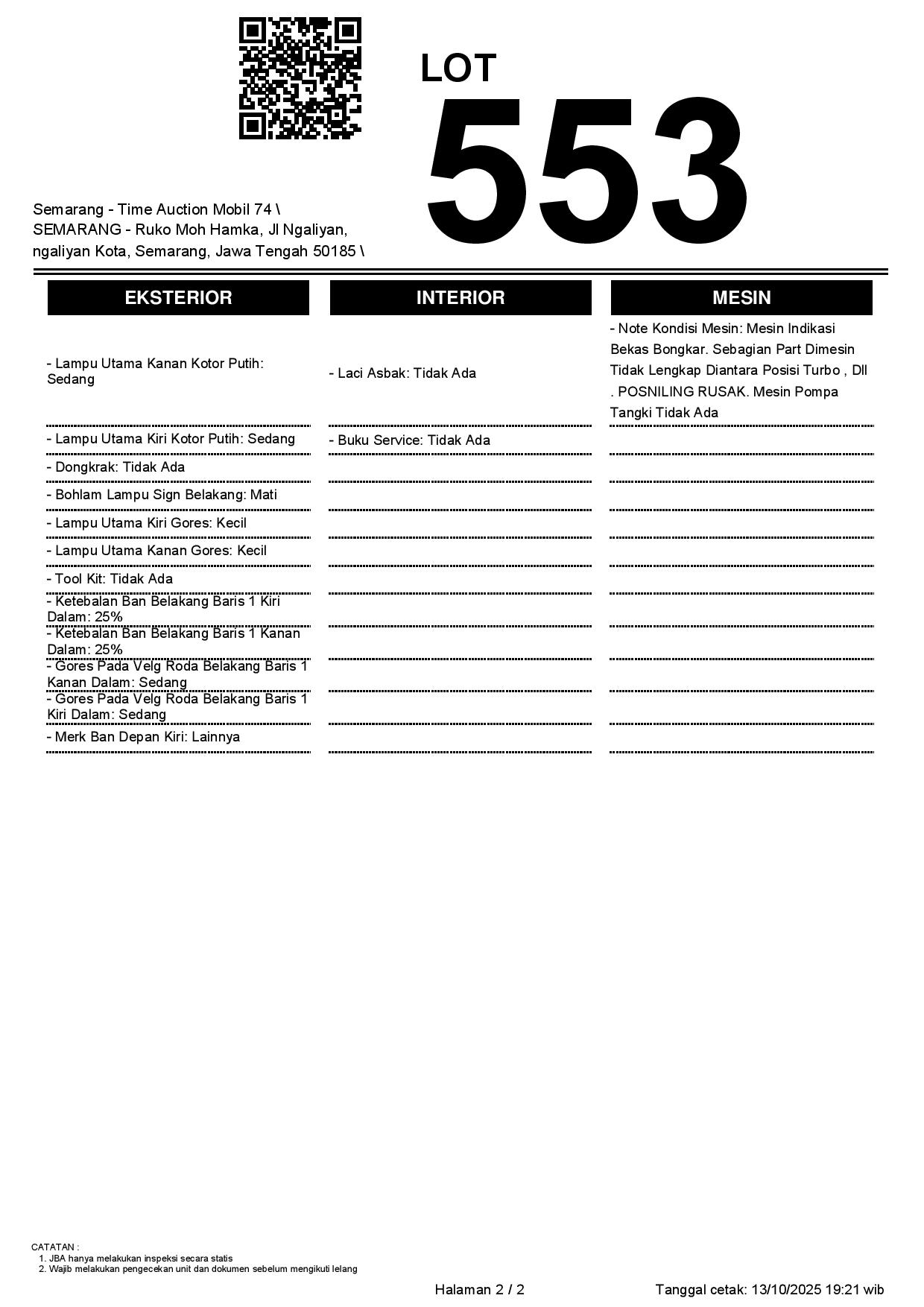 - Kondisi objek lelang dilelang apa adanya, baik kondisi fisik, mesin maupun legalitas kendaraan. Jika terdapat kekurangan/cacat baik yang terlihat maupun yang tidak terlihat, maka semua akan menjadi tanggung jawab/risiko Pemenang Lelang. Oleh karena itu, Pemenang Lelang melepaskan segala hak untuk menuntut dan/atau meminta ganti rugi atas hal tersebut kepada JBA.