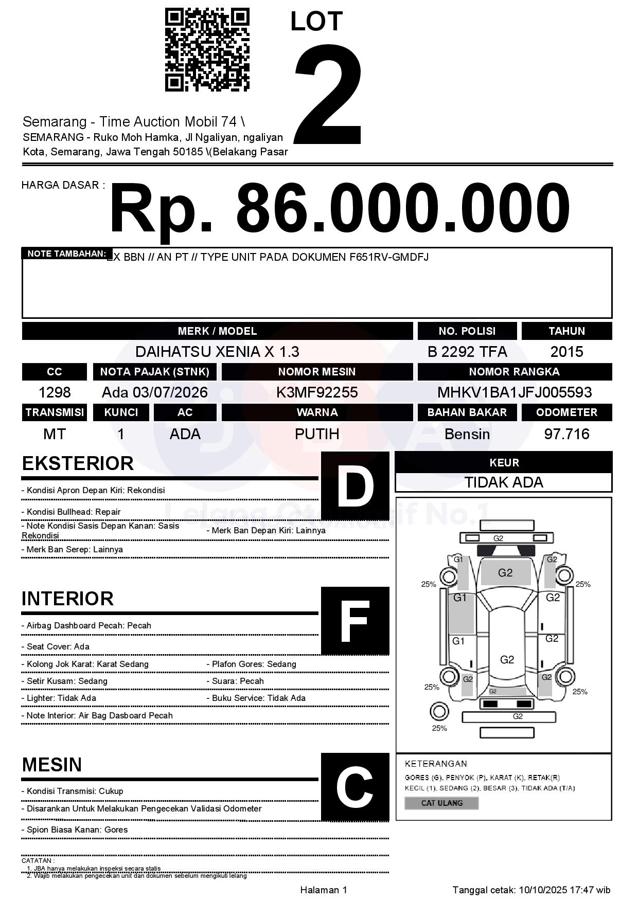 - Kondisi objek lelang dilelang apa adanya, baik kondisi fisik, mesin maupun legalitas kendaraan. Jika terdapat kekurangan/cacat baik yang terlihat maupun yang tidak terlihat, maka semua akan menjadi tanggung jawab/risiko Pemenang Lelang. Oleh karena itu, Pemenang Lelang melepaskan segala hak untuk menuntut dan/atau meminta ganti rugi atas hal tersebut kepada JBA.