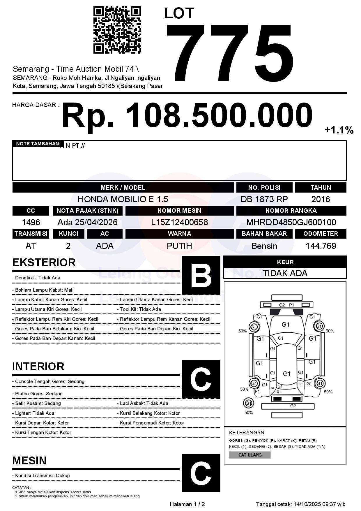 - Kondisi objek lelang dilelang apa adanya, baik kondisi fisik, mesin maupun legalitas kendaraan. Jika terdapat kekurangan/cacat baik yang terlihat maupun yang tidak terlihat, maka semua akan menjadi tanggung jawab/risiko Pemenang Lelang. Oleh karena itu, Pemenang Lelang melepaskan segala hak untuk menuntut dan/atau meminta ganti rugi atas hal tersebut kepada JBA.