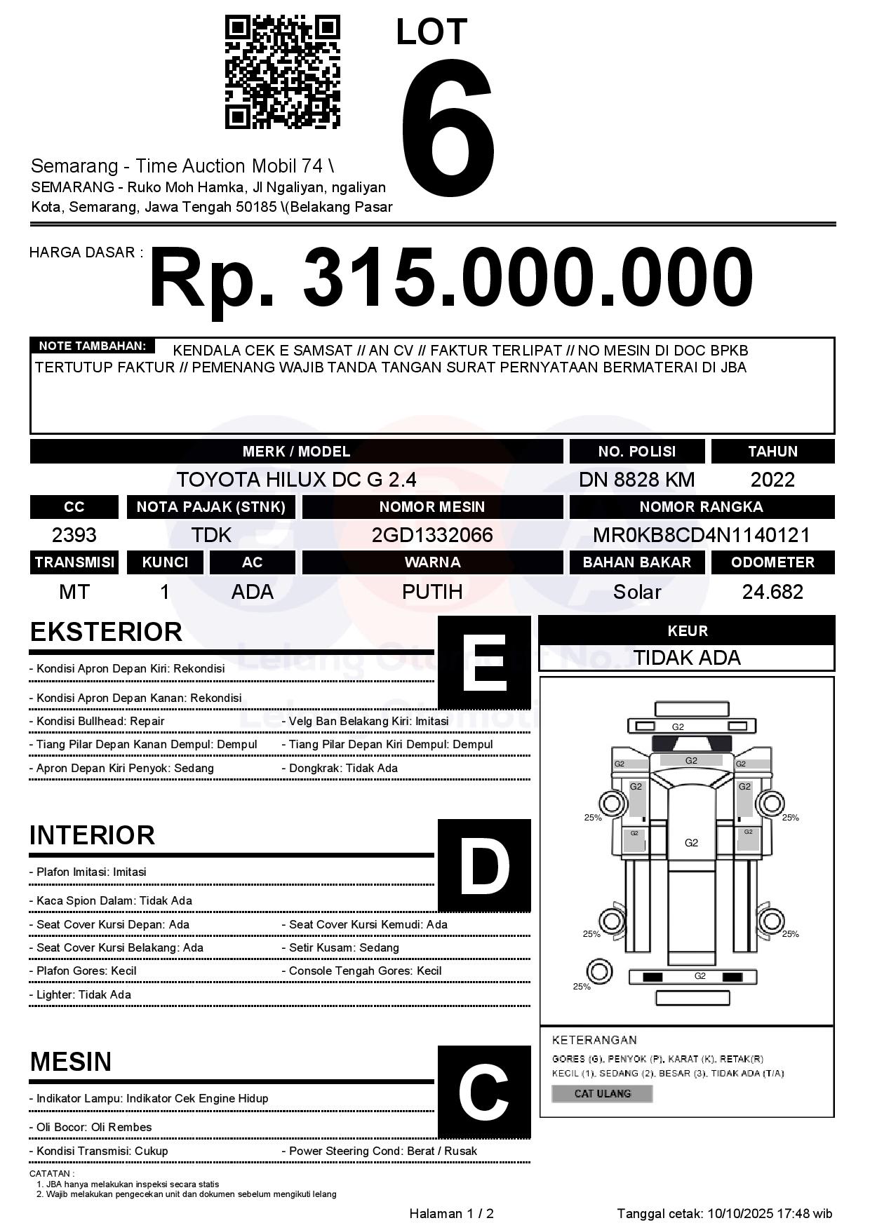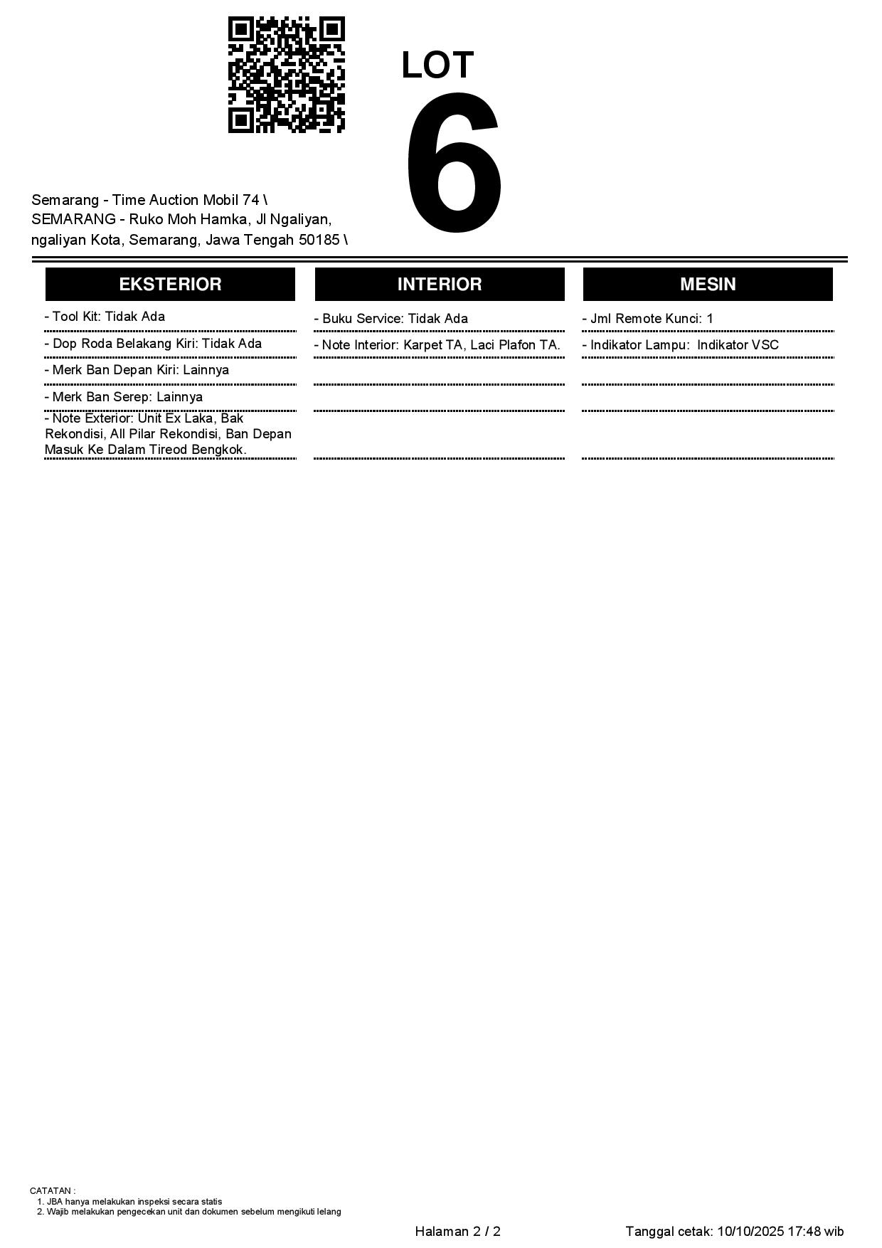 - Kondisi objek lelang dilelang apa adanya, baik kondisi fisik, mesin maupun legalitas kendaraan. Jika terdapat kekurangan/cacat baik yang terlihat maupun yang tidak terlihat, maka semua akan menjadi tanggung jawab/risiko Pemenang Lelang. Oleh karena itu, Pemenang Lelang melepaskan segala hak untuk menuntut dan/atau meminta ganti rugi atas hal tersebut kepada JBA.
