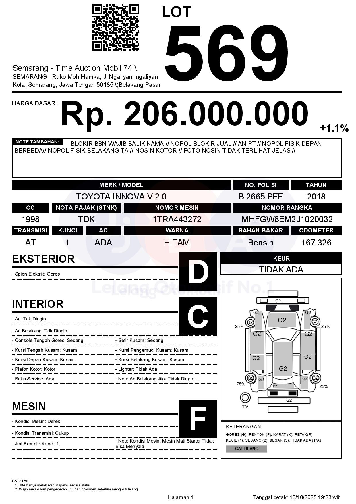 - Kondisi objek lelang dilelang apa adanya, baik kondisi fisik, mesin maupun legalitas kendaraan. Jika terdapat kekurangan/cacat baik yang terlihat maupun yang tidak terlihat, maka semua akan menjadi tanggung jawab/risiko Pemenang Lelang. Oleh karena itu, Pemenang Lelang melepaskan segala hak untuk menuntut dan/atau meminta ganti rugi atas hal tersebut kepada JBA.