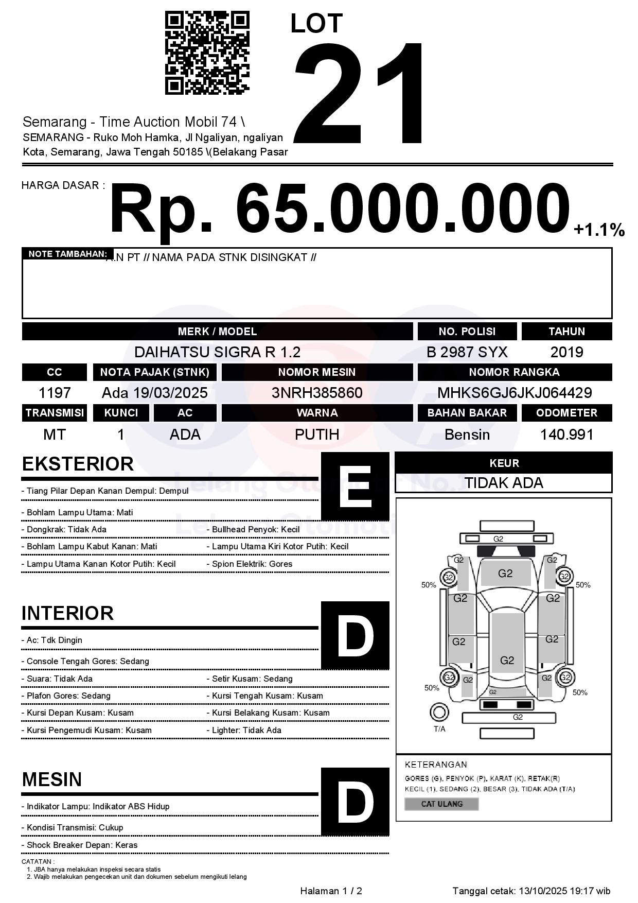 - Kondisi objek lelang dilelang apa adanya, baik kondisi fisik, mesin maupun legalitas kendaraan. Jika terdapat kekurangan/cacat baik yang terlihat maupun yang tidak terlihat, maka semua akan menjadi tanggung jawab/risiko Pemenang Lelang. Oleh karena itu, Pemenang Lelang melepaskan segala hak untuk menuntut dan/atau meminta ganti rugi atas hal tersebut kepada JBA.