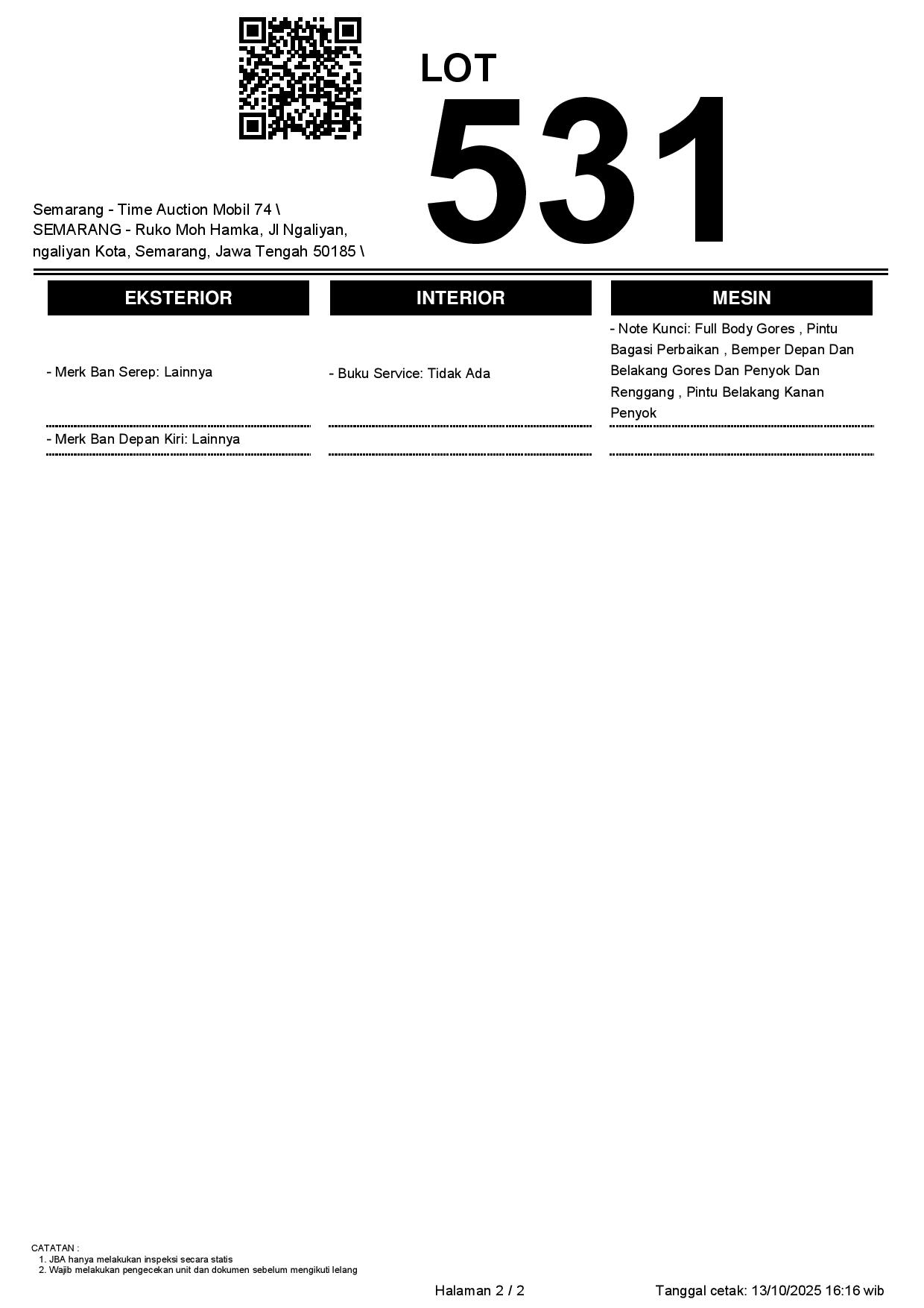 - Kondisi objek lelang dilelang apa adanya, baik kondisi fisik, mesin maupun legalitas kendaraan. Jika terdapat kekurangan/cacat baik yang terlihat maupun yang tidak terlihat, maka semua akan menjadi tanggung jawab/risiko Pemenang Lelang. Oleh karena itu, Pemenang Lelang melepaskan segala hak untuk menuntut dan/atau meminta ganti rugi atas hal tersebut kepada JBA.