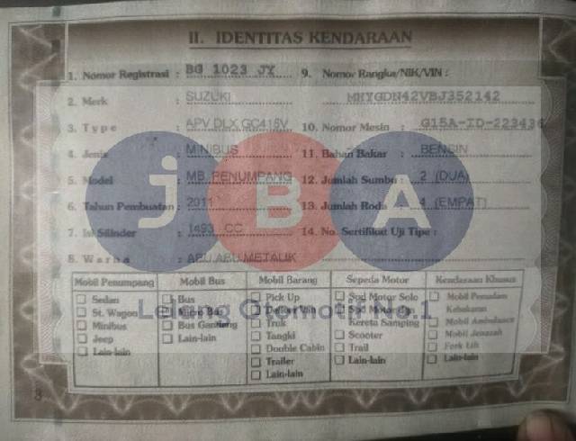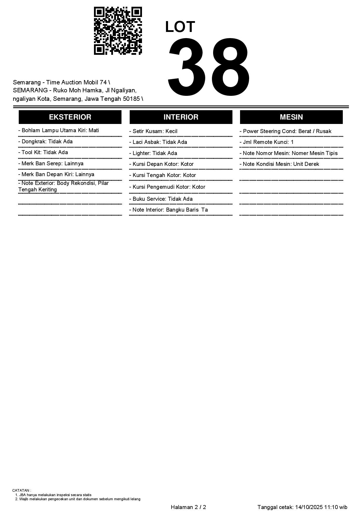 - Kondisi objek lelang dilelang apa adanya, baik kondisi fisik, mesin maupun legalitas kendaraan. Jika terdapat kekurangan/cacat baik yang terlihat maupun yang tidak terlihat, maka semua akan menjadi tanggung jawab/risiko Pemenang Lelang. Oleh karena itu, Pemenang Lelang melepaskan segala hak untuk menuntut dan/atau meminta ganti rugi atas hal tersebut kepada JBA.