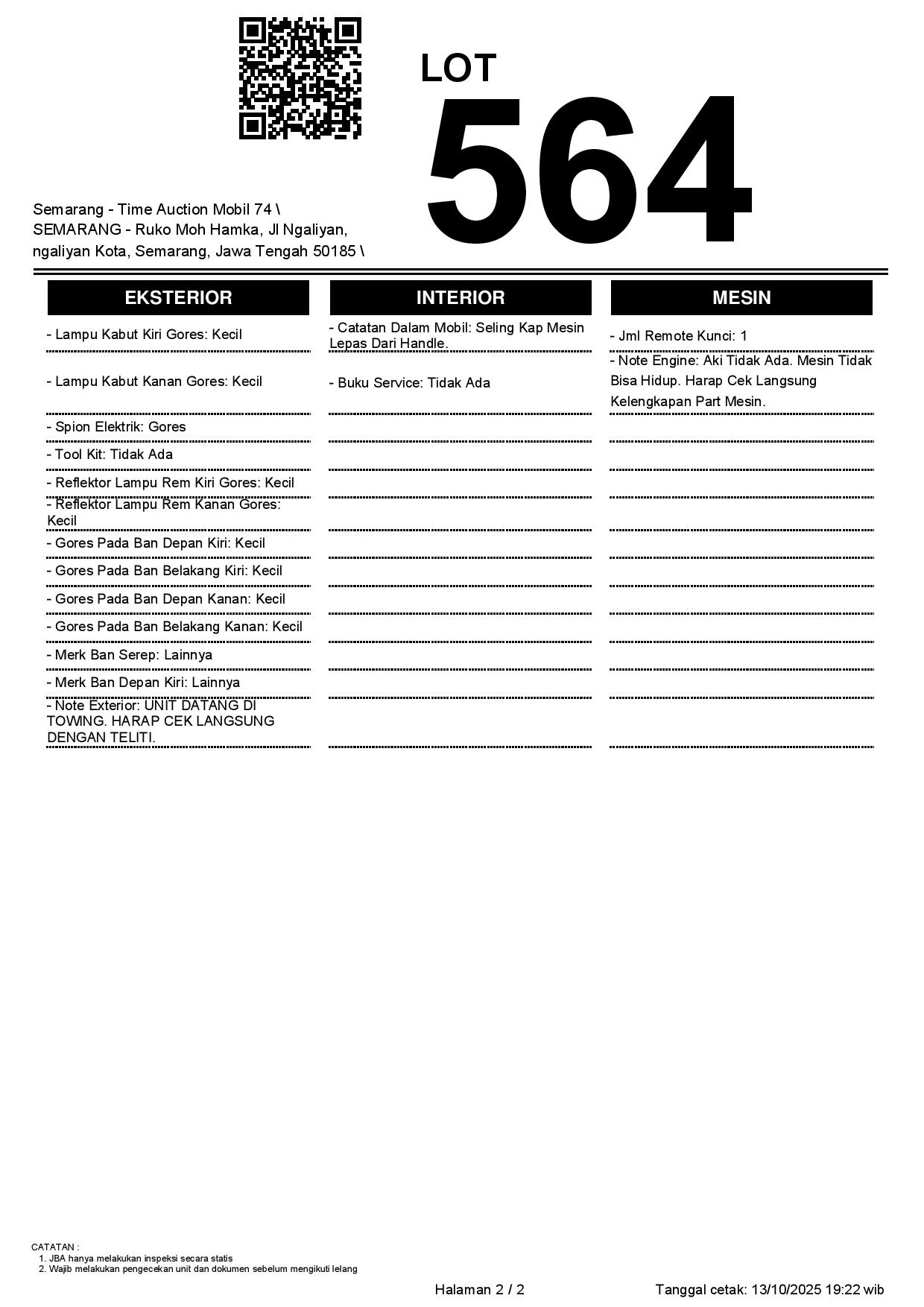 - Kondisi objek lelang dilelang apa adanya, baik kondisi fisik, mesin maupun legalitas kendaraan. Jika terdapat kekurangan/cacat baik yang terlihat maupun yang tidak terlihat, maka semua akan menjadi tanggung jawab/risiko Pemenang Lelang. Oleh karena itu, Pemenang Lelang melepaskan segala hak untuk menuntut dan/atau meminta ganti rugi atas hal tersebut kepada JBA.