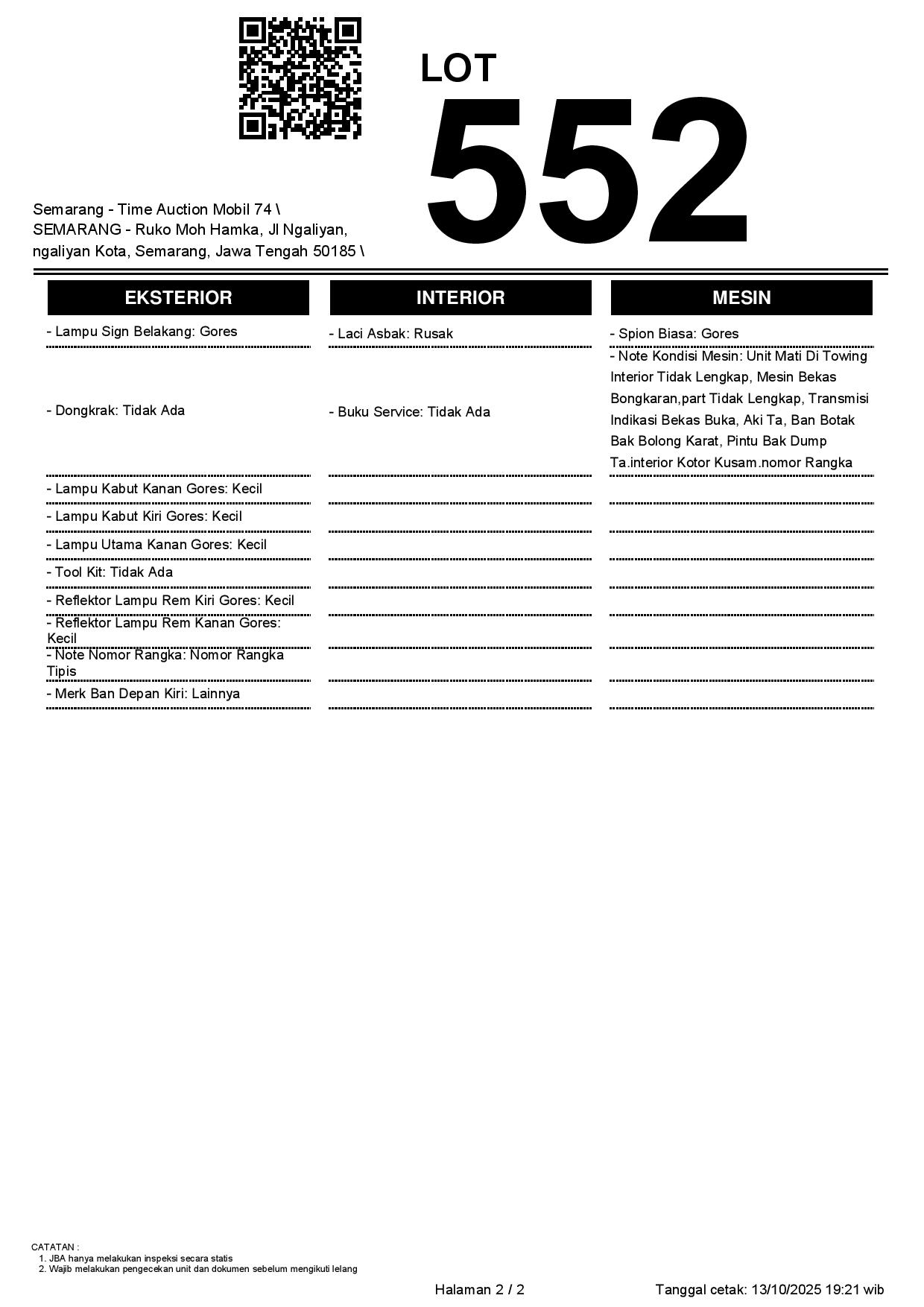 - Kondisi objek lelang dilelang apa adanya, baik kondisi fisik, mesin maupun legalitas kendaraan. Jika terdapat kekurangan/cacat baik yang terlihat maupun yang tidak terlihat, maka semua akan menjadi tanggung jawab/risiko Pemenang Lelang. Oleh karena itu, Pemenang Lelang melepaskan segala hak untuk menuntut dan/atau meminta ganti rugi atas hal tersebut kepada JBA.