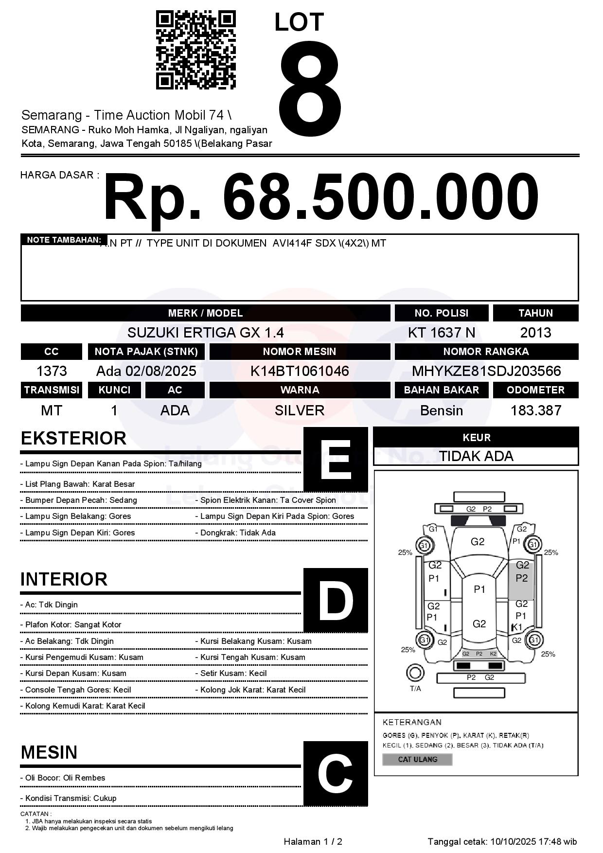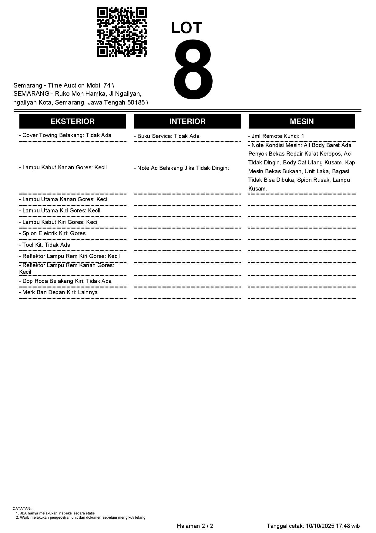 - Kondisi objek lelang dilelang apa adanya, baik kondisi fisik, mesin maupun legalitas kendaraan. Jika terdapat kekurangan/cacat baik yang terlihat maupun yang tidak terlihat, maka semua akan menjadi tanggung jawab/risiko Pemenang Lelang. Oleh karena itu, Pemenang Lelang melepaskan segala hak untuk menuntut dan/atau meminta ganti rugi atas hal tersebut kepada JBA.