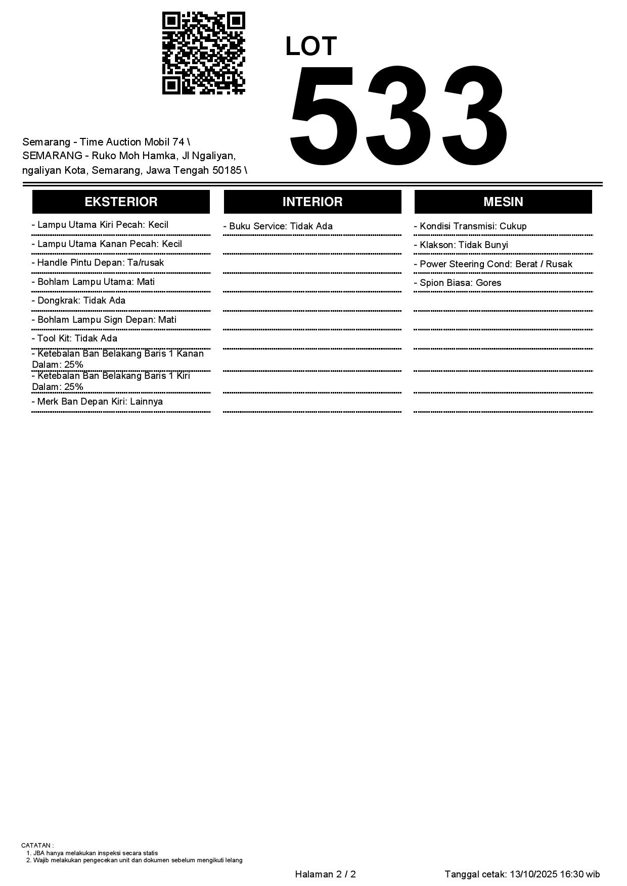 - Kondisi objek lelang dilelang apa adanya, baik kondisi fisik, mesin maupun legalitas kendaraan. Jika terdapat kekurangan/cacat baik yang terlihat maupun yang tidak terlihat, maka semua akan menjadi tanggung jawab/risiko Pemenang Lelang. Oleh karena itu, Pemenang Lelang melepaskan segala hak untuk menuntut dan/atau meminta ganti rugi atas hal tersebut kepada JBA.