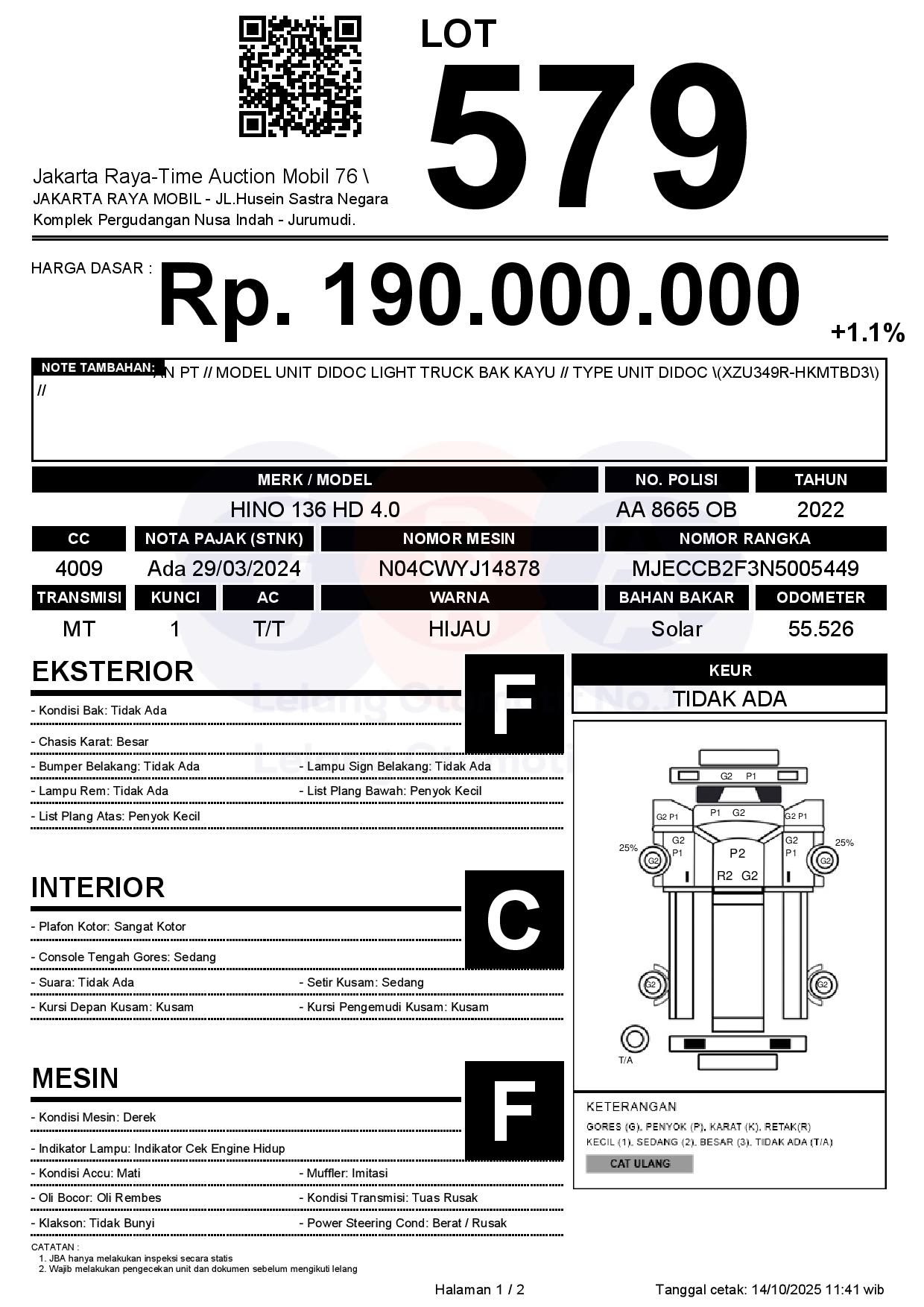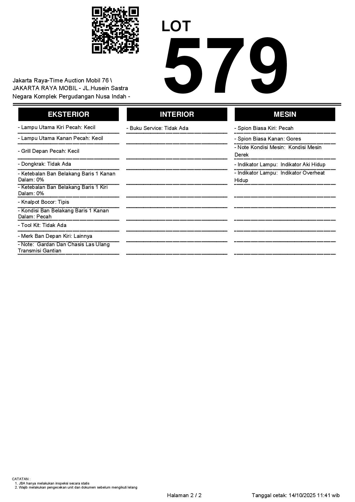 - Kondisi objek lelang dilelang apa adanya, baik kondisi fisik, mesin maupun legalitas kendaraan. Jika terdapat kekurangan/cacat baik yang terlihat maupun yang tidak terlihat, maka semua akan menjadi tanggung jawab/risiko Pemenang Lelang. Oleh karena itu, Pemenang Lelang melepaskan segala hak untuk menuntut dan/atau meminta ganti rugi atas hal tersebut kepada JBA.