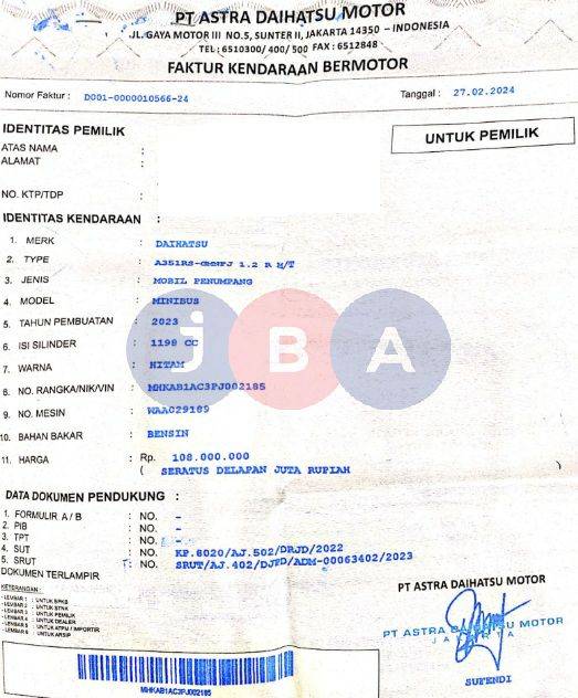 - Kondisi objek lelang dilelang apa adanya, baik kondisi fisik, mesin maupun legalitas kendaraan. Jika terdapat kekurangan/cacat baik yang terlihat maupun yang tidak terlihat, maka semua akan menjadi tanggung jawab/risiko Pemenang Lelang. Oleh karena itu, Pemenang Lelang melepaskan segala hak untuk menuntut dan/atau meminta ganti rugi atas hal tersebut kepada JBA.