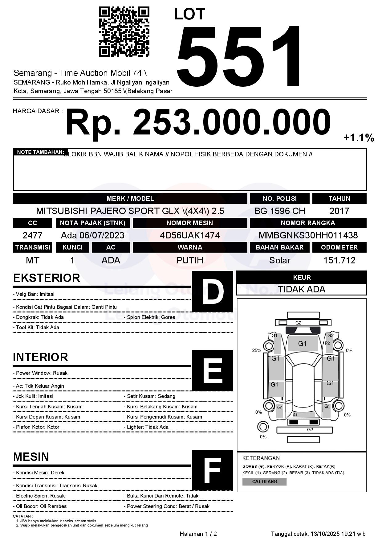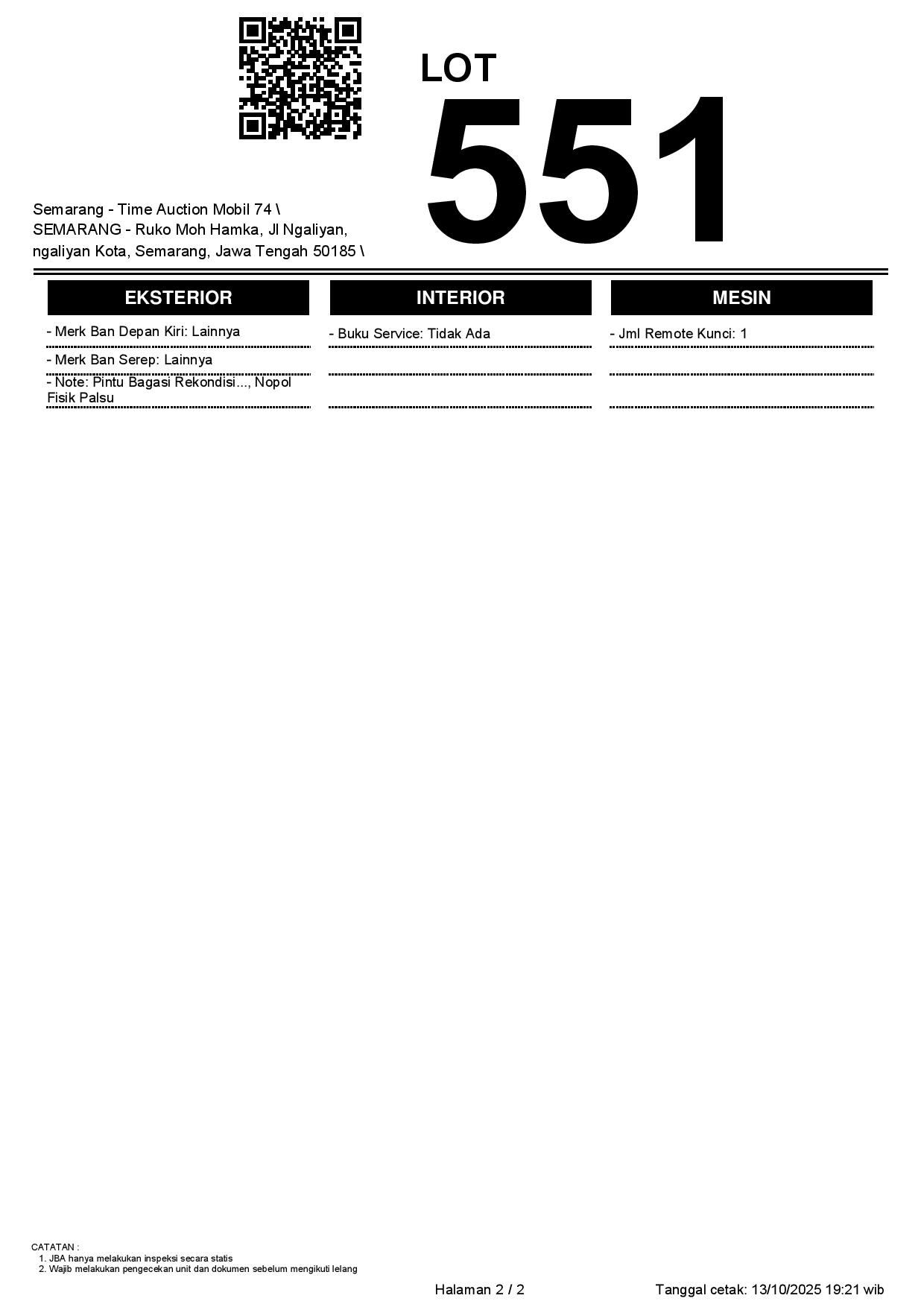 - Kondisi objek lelang dilelang apa adanya, baik kondisi fisik, mesin maupun legalitas kendaraan. Jika terdapat kekurangan/cacat baik yang terlihat maupun yang tidak terlihat, maka semua akan menjadi tanggung jawab/risiko Pemenang Lelang. Oleh karena itu, Pemenang Lelang melepaskan segala hak untuk menuntut dan/atau meminta ganti rugi atas hal tersebut kepada JBA.