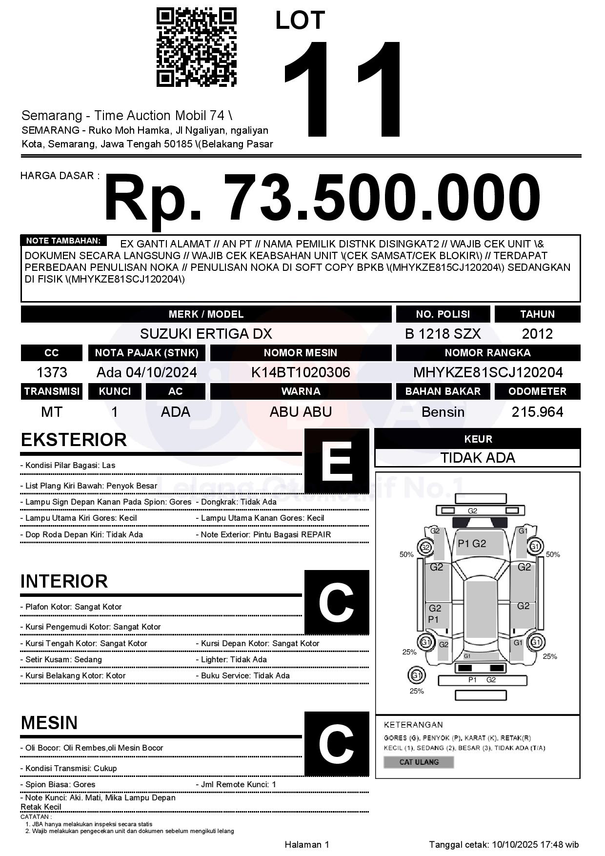 - Kondisi objek lelang dilelang apa adanya, baik kondisi fisik, mesin maupun legalitas kendaraan. Jika terdapat kekurangan/cacat baik yang terlihat maupun yang tidak terlihat, maka semua akan menjadi tanggung jawab/risiko Pemenang Lelang. Oleh karena itu, Pemenang Lelang melepaskan segala hak untuk menuntut dan/atau meminta ganti rugi atas hal tersebut kepada JBA.