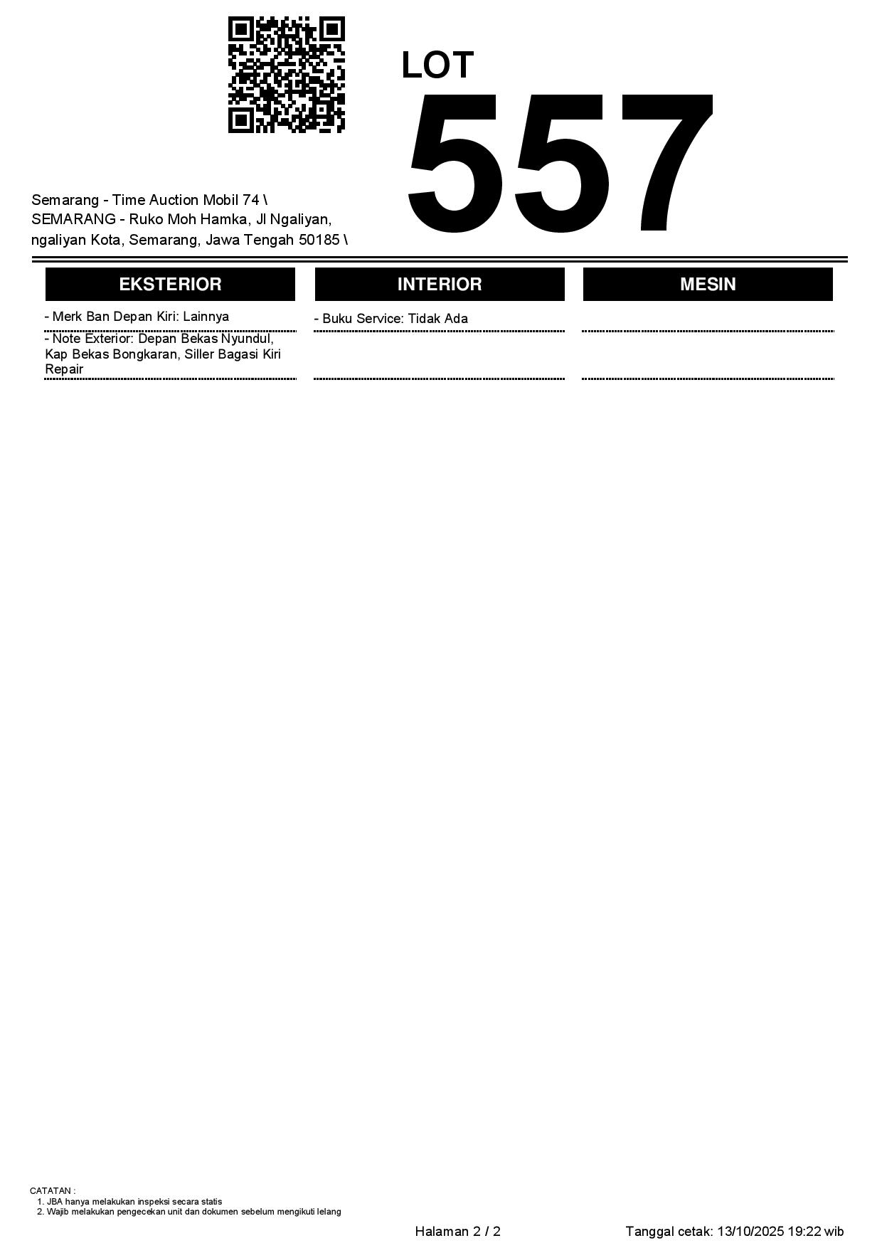 - Kondisi objek lelang dilelang apa adanya, baik kondisi fisik, mesin maupun legalitas kendaraan. Jika terdapat kekurangan/cacat baik yang terlihat maupun yang tidak terlihat, maka semua akan menjadi tanggung jawab/risiko Pemenang Lelang. Oleh karena itu, Pemenang Lelang melepaskan segala hak untuk menuntut dan/atau meminta ganti rugi atas hal tersebut kepada JBA.