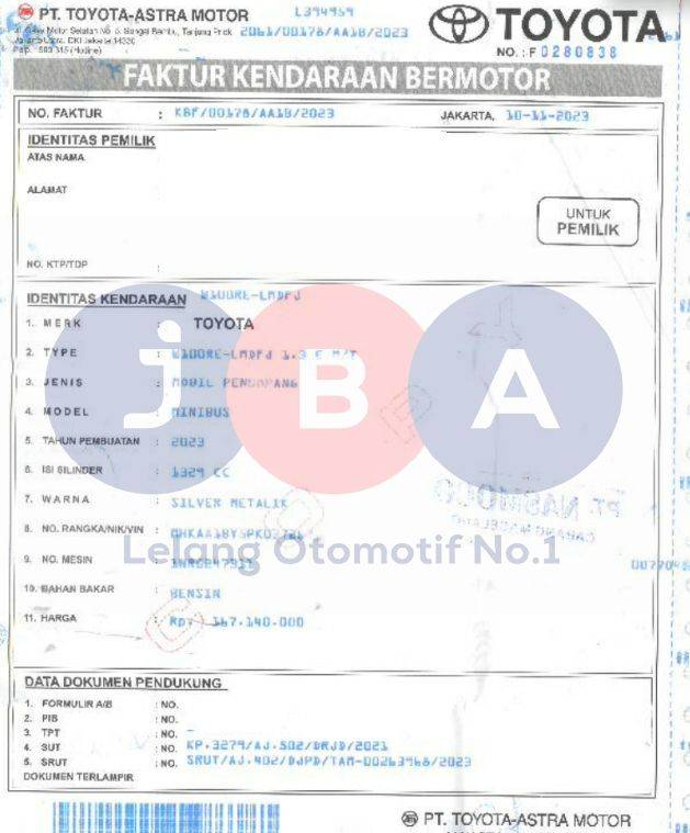 - Kondisi objek lelang dilelang apa adanya, baik kondisi fisik, mesin maupun legalitas kendaraan. Jika terdapat kekurangan/cacat baik yang terlihat maupun yang tidak terlihat, maka semua akan menjadi tanggung jawab/risiko Pemenang Lelang. Oleh karena itu, Pemenang Lelang melepaskan segala hak untuk menuntut dan/atau meminta ganti rugi atas hal tersebut kepada JBA.
